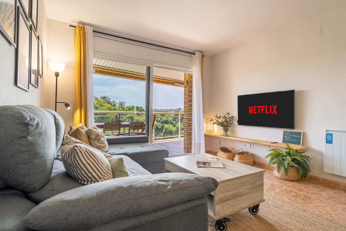 Quiet penthouse in the heart of Salou. A 3-minute walk from the beach. With a terrace and private solarium with panoramic views, perfect for sunbathing or watching the sunset and enjoying a drink. Fully equipped with everything you need (barbecue, air conditioning, towels, bedding, hairdryer, iron, Nespresso coffee maker, hot water thermos...) -In front of pine forests, leisure areas, restaurants, bars, and public transportation. Well connected, 5 minutes from Portaventura/Ferrariland/Caribe Aq. Parks.