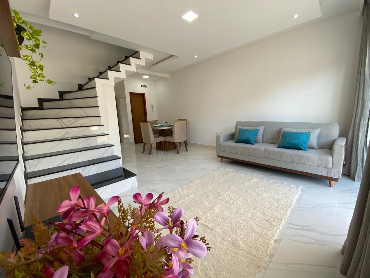 This stylish home is perfect for group travel. House located in a gated community with 24-hour concierge. Beautiful garden with swimming pool, shower, gourmet area with barbecue. Garage for 2 cars, living room with well-ventilated American kitchen, TV room with sofa. Large balcony with sofas, hammocks and dining table! There are 3 air conditioners, 2 in the en-suite and 1 in the living room.