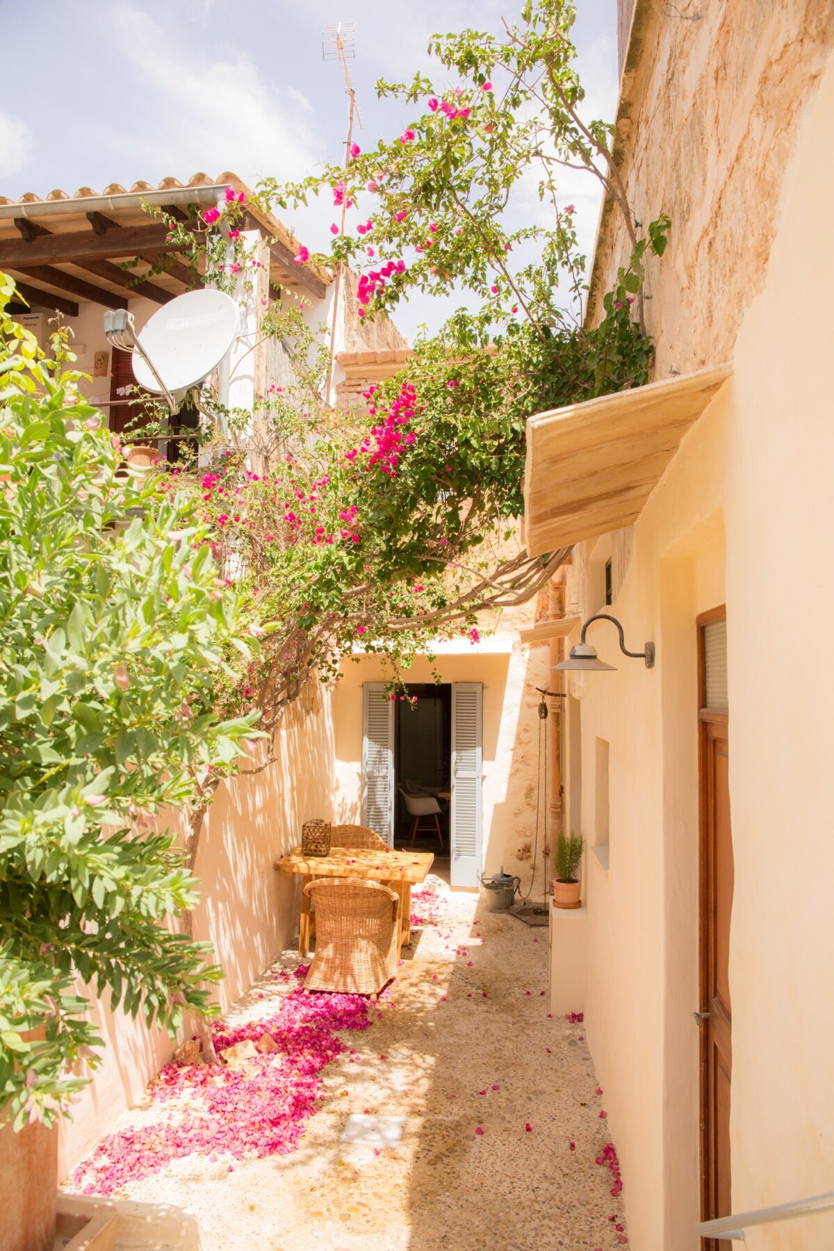 Lovingly renovated Majorcan village house with patio and roof terrace in SantanyiThrough the generous living and dining room with open kitchen on the ground floor you enter the patio, which offers relaxation space on 2 levels. In the rear part of the ground floor there is a cozy double bedroom with water bed, a bathroom and a small single bedroom. Upstairs there is another living room with mini-kitchen, a double and a single bedroom plus a bathroom with shower.