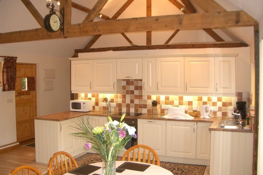 Cae Pren, a charming, hand crafted, single-storey lodge in the rural outskirts of New Mills, Powys, in the tranquil Mid Wales countryside. With a luxurious private hot tub, picturesque views, this idyllic retreat is ideal for couples looking to escape the hustle and bustle of everyday life and immerse themselves in a peaceful and romantic setting. The open-plan living space kitchen/dining area, and a cosy sitting area with 50inch Smart TV. The bedroom has a luxury king-size bed. 2steps to lodge