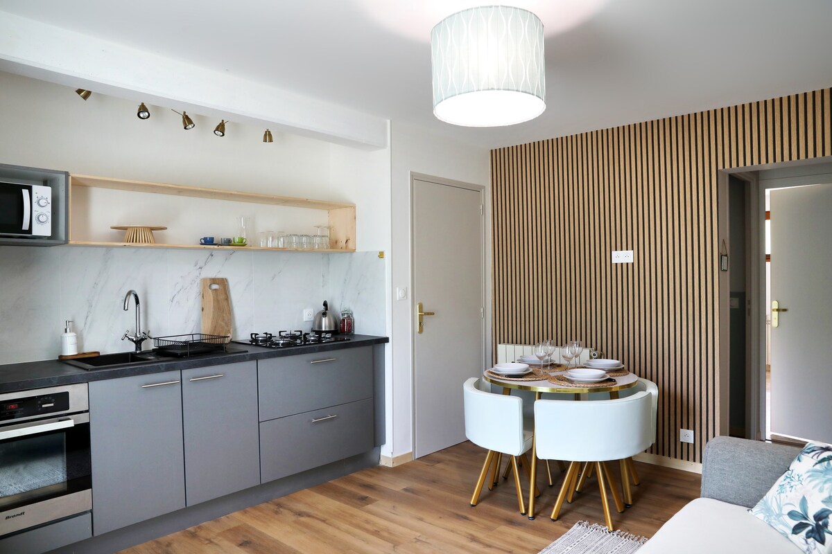 Enjoy the lovely setting of this spot in the city center of Cahors. This 30 m2 studio, refurbished, with a high-end fold-away bed that turns the living room into a bedroom in the snap of a finger! The must-have of this gem: a terrace to enjoy the sun, eat your meals outside, and its Jacuzzi heated all year round to rest from your days of sightseeing! This space is the perfect place to explore the city. Parties and noise nuisance are prohibited!