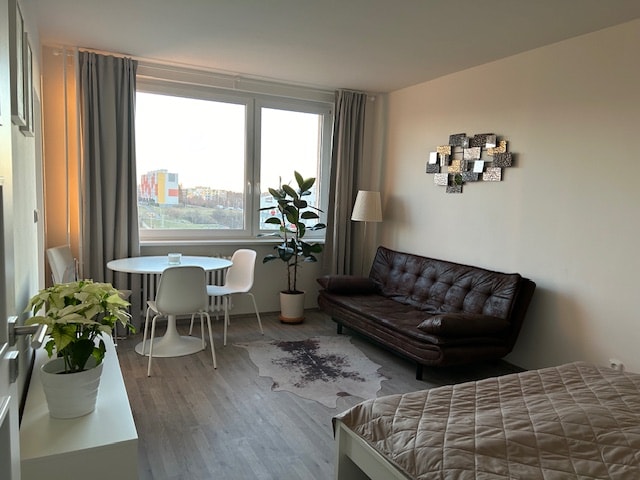 Discover the charm of modern living in our designer studio at the Hagibor complex! Enjoy the comfort of home with a fully equipped kitchen, Nespresso coffee maker, and relaxing book or Netflix evenings. With a balcony, garage parking, and fast internet, it's an oasis of calm in the bustling city. Just a short walk from Želivského metro station on the green line, you're moments away from the historic city center. The perfect place for your urban adventure!:-)