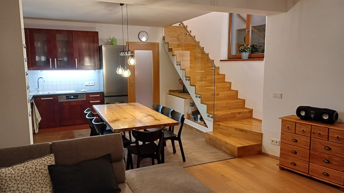 Modernly furnished, two-storey apartment 115m2 with a garden in a quiet part of Prague-4, near Kunratický Forest. 9 km from the center of Prague. The largest shopping center in the Czech Republic (Westfield Chodov) 2.2 km, Aquapalac Čestlice 7.7 km. Free Wi-Fi and free street parking in front of the house. The apartment has 3 bedrooms, a living room, a fully equipped kitchen and 2 bathrooms. Bed linen and towels are included. Seating is available on the terrace on both sides of the house. The garden is shared with two other apartments.