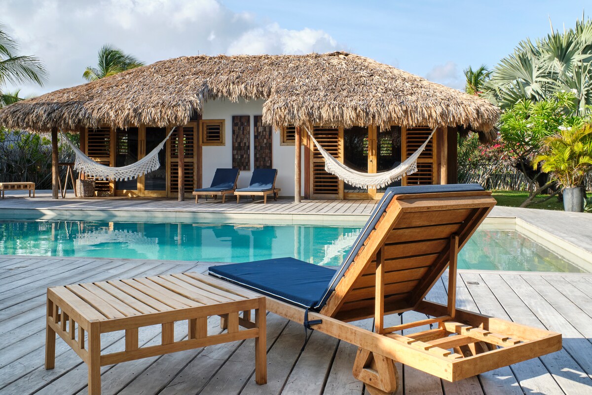 On the banks of the Jaguaribe River's meeting with the sea, Casa Pipa is in a privileged and high-level location, in the luxurious Jaguaribe Villas condominium, right next to the Jaguaribe Lodge and Jaguaríndia Village hotels and in front of one of the best kitesurfing spots in Brazil, where 3 referenced kite schools operate. We have 4 luxurious air-conditioned rooms, a full kitchen, a gourmet area with a swimming pool, parking and a zen space for practicing yoga and relaxing outdoor massages.