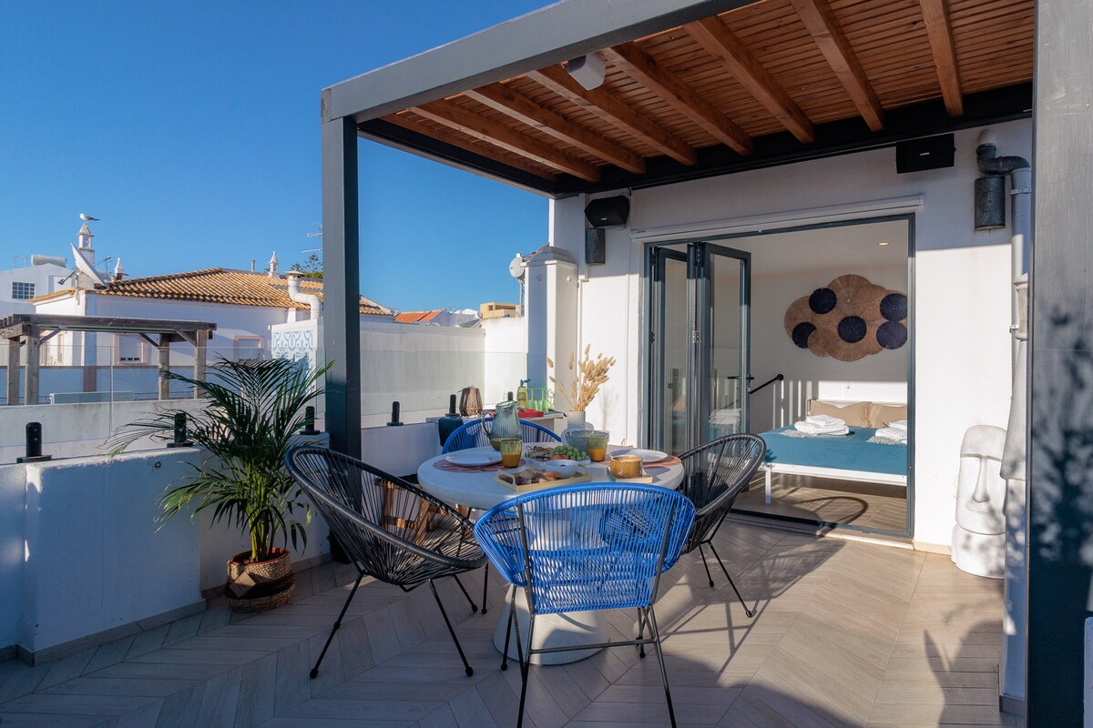 Fantastic rooftop beach duplex with a south-facing balcony that offers all-day sunlight and breathtaking sea views. Nestled in a private condominium with a pool, this apartment is perfectly located in the heart of Alvor, a charming fishing village just under an hour's drive from Faro airport. The beach is only a 7-minute walk away! Fully equipped for a comfortable stay, it includes a TV, Wi-Fi, air conditioning in the bedrooms and living room, and a stocked kitchen for your cooking needs.
