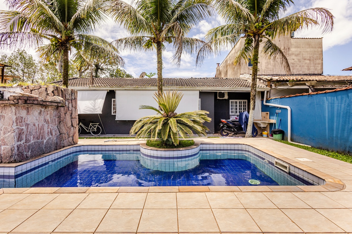 Spacious and charming beach house, comfortable & well maintained. Ideal for families with kids. Accessible for wheelchairs. Tranquil, lush green setting in a garden with exotic fruits. Large pool that catches the sun all day long. Separate BBQ area. An easy 6 mins walk to both Riviera & Itaguaré beaches. Stable & powerful (350Mb) wifi make home office a viable option. Fully equipped kitchen with dishwasher. Air conditioning in all 4 bedrooms. Large beds. **Sheets + towels provided.**