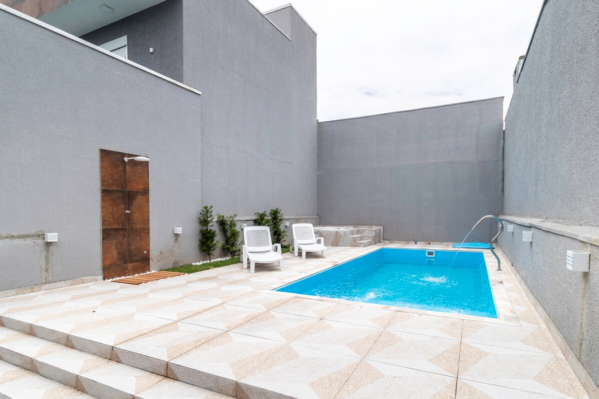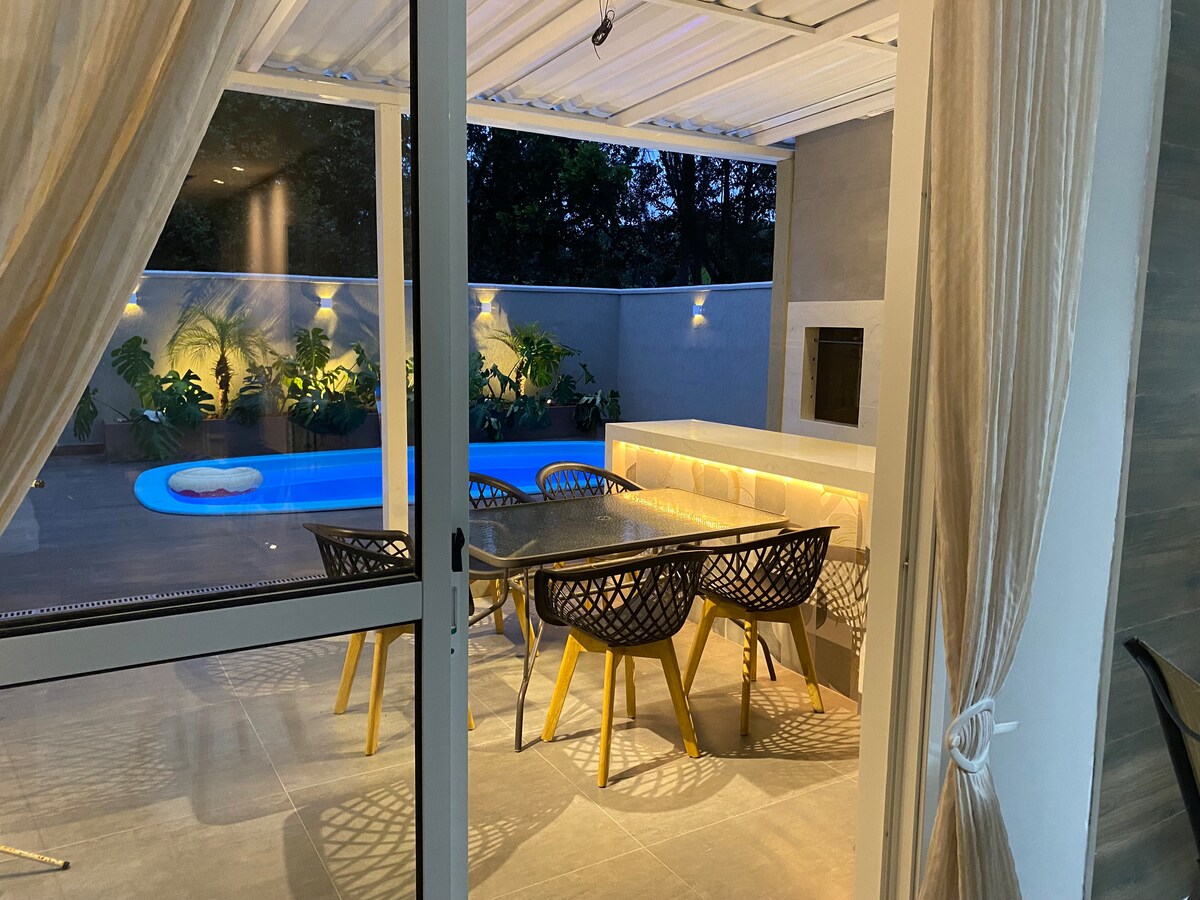 Relax with your whole family in a charming and cozy new home. The structure is modern and designed, solar-heated pool, spacious leisure area, equipped barbecue, rooms with Daikin air-conditioners activated via Wi-Fi, gas-heated faucets and showers, 24-hour monitored alarm and external cameras. We provide a beach cart, chairs, and sunshade. Enjoy good times. 7 min from the shipment to Ilha do Mel.