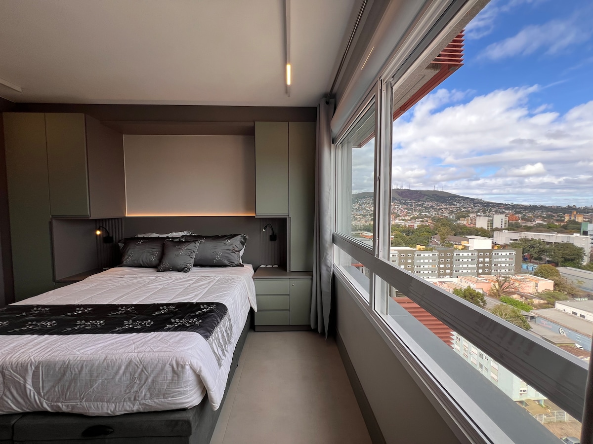 Brand new studio 43sqm in TREND CITY, amazing panoramic view (16th floor) to Guaíba Lake, Lake Shore and Marinha Park, condominium with complete infrastructure, concierge 24h, parking space, gym, 20m heated pool. Queen size beds, space to work with laptop, hot and cold air-conditioning 24,000, Smart TV 50, cable TV NET HD with 250 channels, Wi-Fi 250 mbps, barbecue pit, wash and dryer machine, iron, hair dryer, microwave, airfryer, tag and electronic lock.