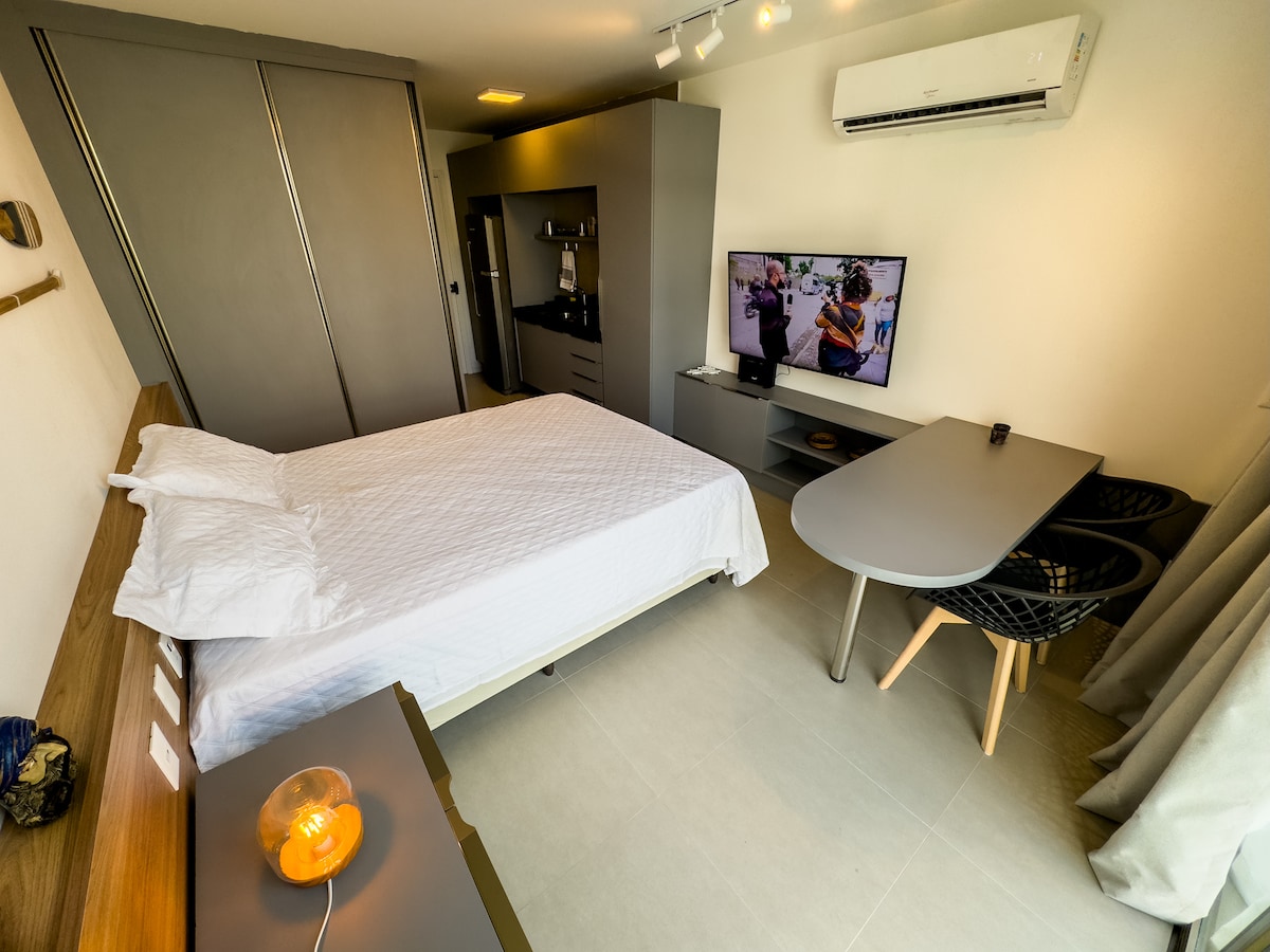 This unique place has a style all its own. Perfect for those who are going to work or enjoy a few days in Recife. Great location, close to the beach, the main Shopping malls, restaurants, bakeries, cafes, etc. Our apartment has a comfortable queen-size bed and an auxiliary bed. Premium bed linens. 50" TV. Internet. Well-equipped kitchen. A comfortable table for meals or work. Building with parking, laundry, coworking, gourmet space, swimming pool, whirlpool, fitness center.