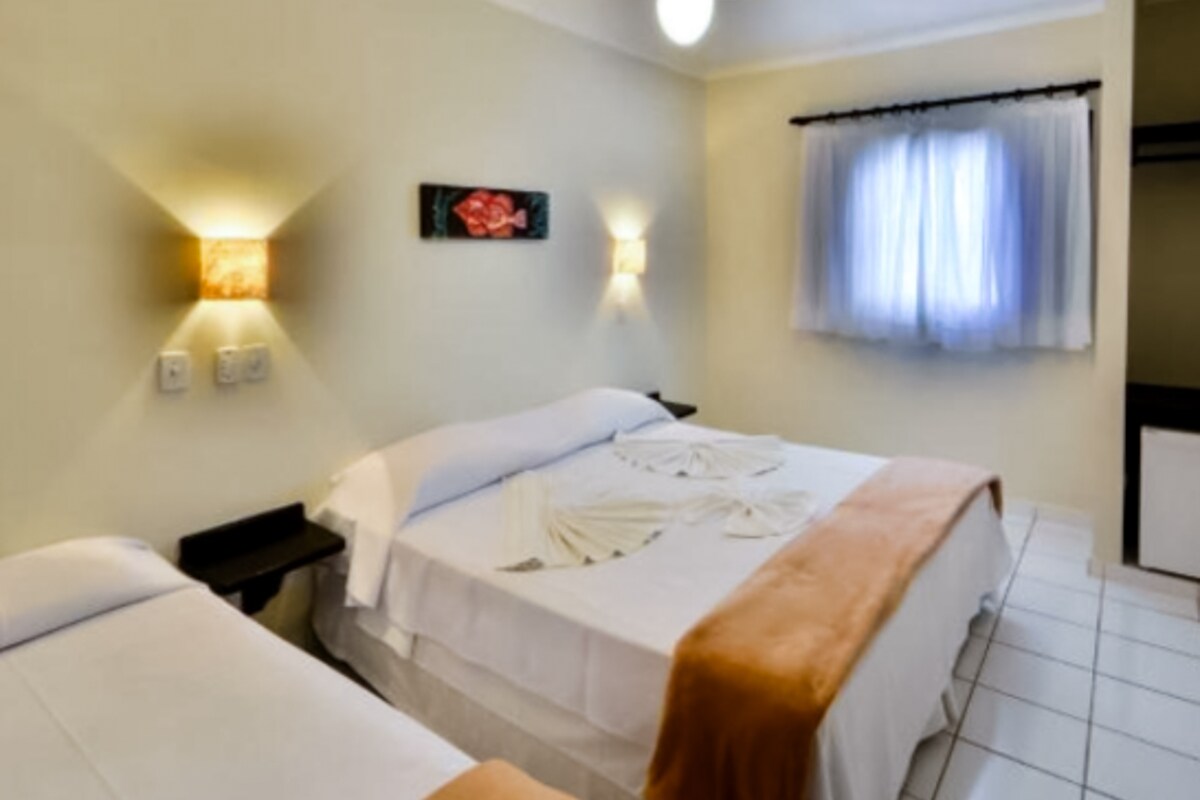 Equipado com uma cama de casal e duas camas de solteiro, frigobar, Wi-Fi, TV de LED, ar-condicionado, enxoval completo e banheiro privativo com amenidades de banho. Acomoda até 4 pessoas.