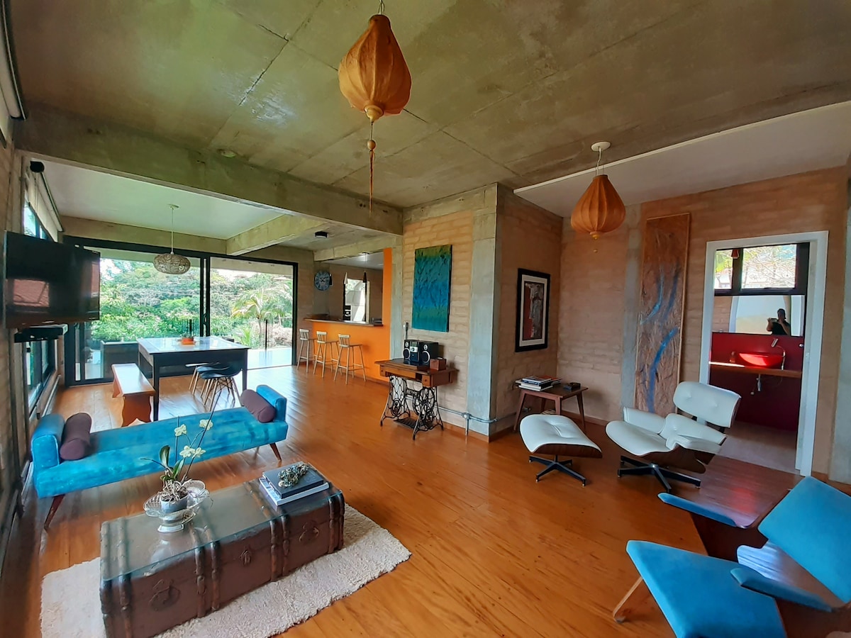House with style and comfort, 5-star suite (gas shower and large bathtub for two with hydro, air conditioning, ceiling fan, quality queen mattress, 400-thread cotton sheets, TV, fast WIFI - two providers, balcony with hammock, view of the Atlantic forest and spacious closet. For your extra comfort - fireplace, full kitchen and barbecue kiosk, swimming pool for two, sauna and river, all private. Fenced garden for your pet. Quiet condominium, easy access to the beaches.