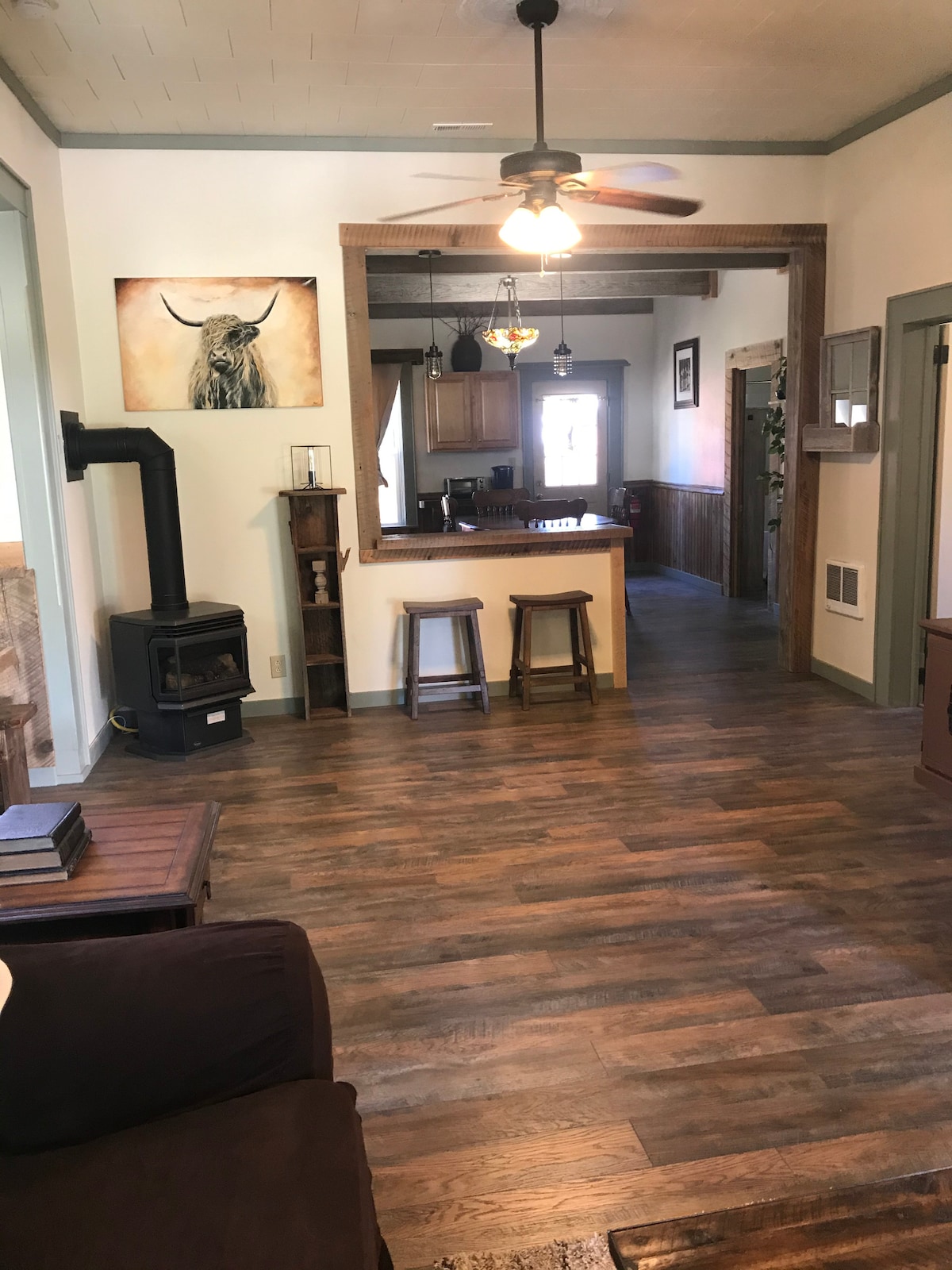 Charming 1908 Craftsman on the Fish House Inn & RV Park grounds in central Dayville. This ground-floor home features 3 bedrooms (2 queen, 1 twin), 1 bath, kitchen, dining room, and living room with satellite TV. Original wood floors, pocket doors, and wallpaper add vintage charm. Furnished with family heirlooms and eclectic fish decor. Enjoy a private back patio with grill, plus a lush lawn with fruit and shade trees. A cozy, memorable stay in Eastern Oregon.