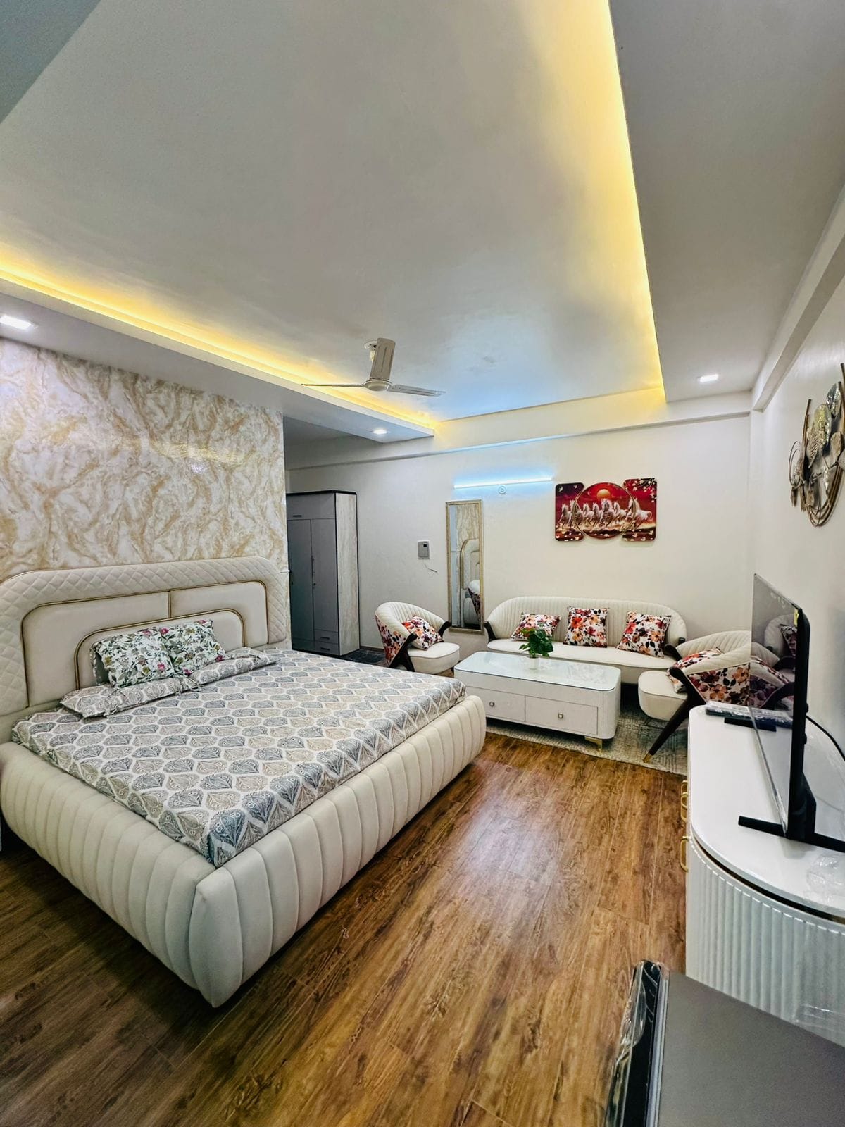 Enjoy a comfortable stay in our centrally-located and beautifully designed 1BHK apartment in Vrindavan. This apartment is a perfect blend of convenience and serenity. The apartment provides a peaceful retreat while keeping you well connected to the city. Multiple multi-cuisine restaurants, grocery stores, and daily-need shops are located just outside the property, ensuring all essentials are easily accessible during your stay.