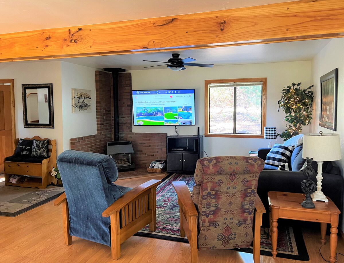 In the Pines - Two Outdoor Patios - Gas BBQ - Prescott National Forrest - Air Conditioning and Heat! Kitchen Fully Equipped - Fireplace - SMART TV's In Living Room and Bedrooms - Newly Remodeled! Two Bedrooms- -QUEEN with on suite Bathroom an 43'' Smart TV -(2) TWIN bed guest room With Smart TV Two Full Bathrooms With Shower and Tub Shower Living room- Large Smart TV and Streaming - Couch pulls out to KING Bed Two Outdoor Decks With Gas Grill and Patio Furniture FAST WIFI!