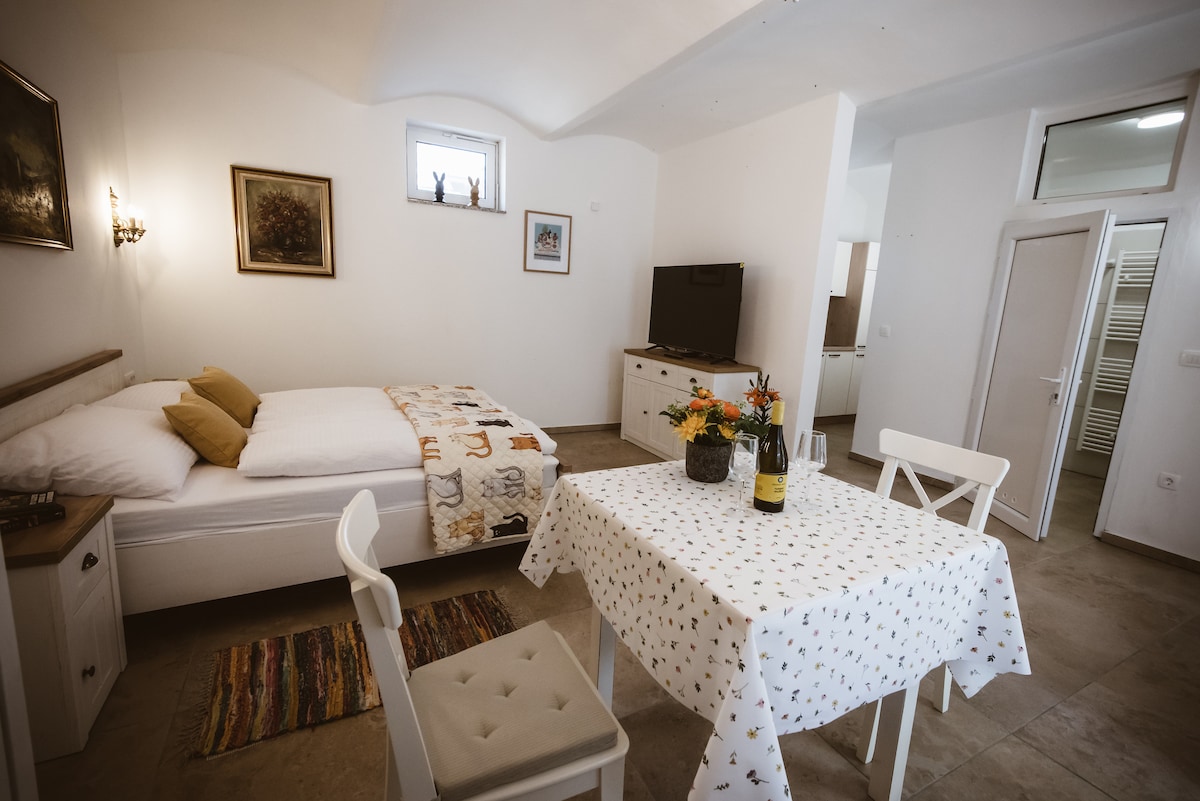 Enjoy at spacious outdoor place in rustic green environment, within walking distance of a large thermal complex and a golf course. This open-space appartment is entirely on the same level (including the shower in the bathroom); the passages between the individual parts are easy to pass also for disabled people. It shares a large yard and the garden with another apartment. Available are a grill and bicycles for wandering along the picturesque cycling trails in the area. Pets are wellcome.