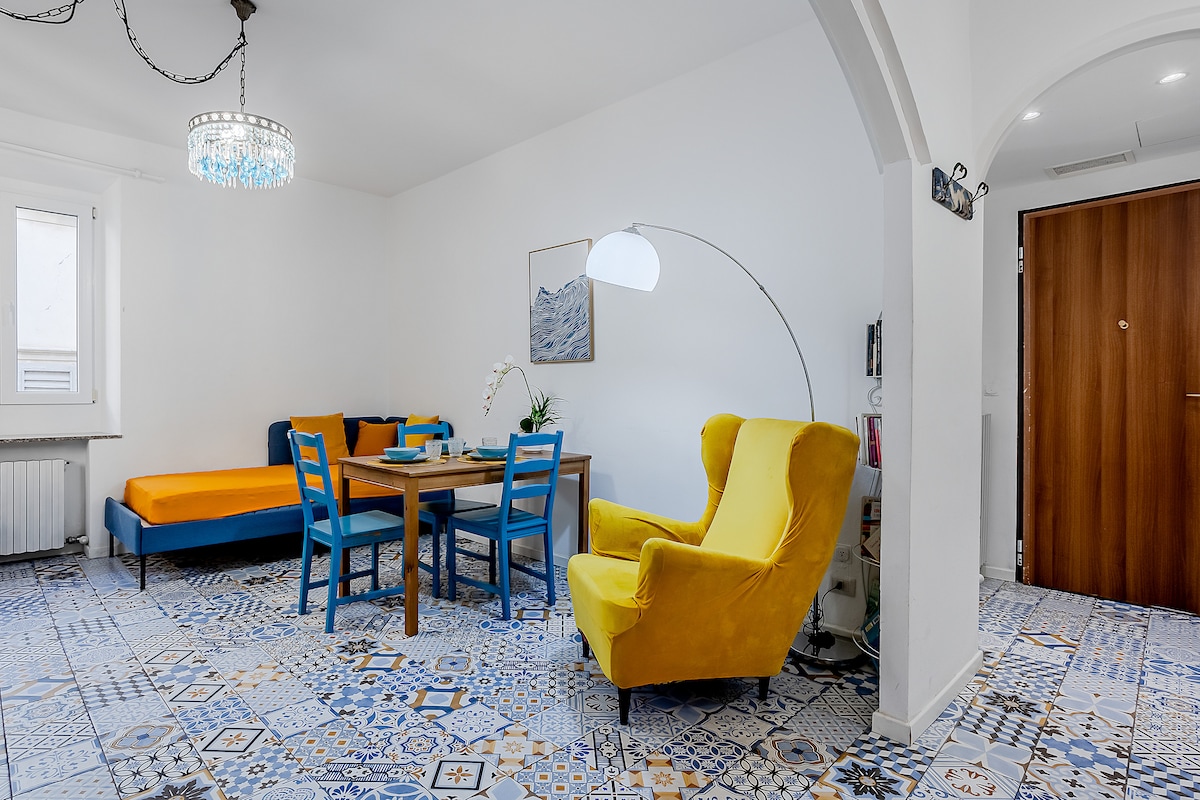 The apartment is located in the Oltretorrente neighborhood, in the historic center, close to all the areas of socio-cultural interest in the city. Recently renovated, it is on the second floor of an old monastery served by an elevator. The studio, despite being modest in size, includes a full kitchen, a large dining table, a single bed and 1/2 (120cm wide and comfortable even for two people) and a truly luxurious bathroom.