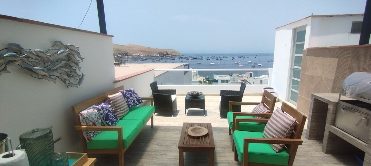 A special place where you can work or relax looking at the peaceful sea of Pucusana Bay while hearing seabirds and fishing boats. A safe and quiet place, without cars and surrounded by nature. We are part of an association available for any questions. Shopping and restaurants with delivery services. Ideal for disconnecting with family, partner or friends, as well as seeing marine fauna, doing water sports, diving, working in peace and enjoying Peruvian cuisine.