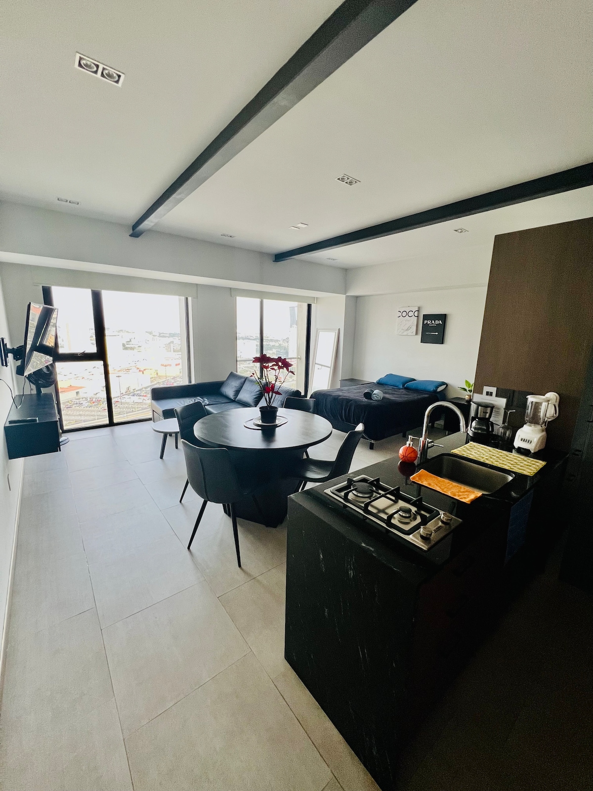 Apartment on the 19th floor with terrace, enjoy the best view of Puebla, Loft style with open space, private covered parking and parking for visitors, modern furniture, Smart TV with 1700 channels, 22 thousand movies, Prime Video, YouTube, WIFI 🛜, Stereo with Bluetooth, Fan, Microwave, Equipped Kitchen, cleaning utensils, Black Out Curtains, Pantry, 24 hour security, perfect for executives, couples or small families, in the most exclusive area, NO PARTIES, NO PETALS, NO WAX.