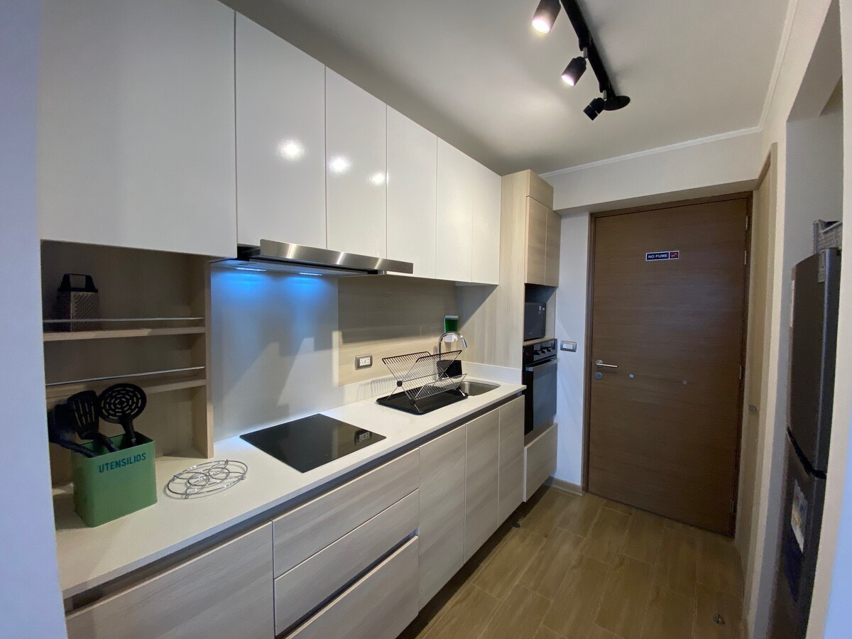 Modern and cozy apartment with partial ocean view, ideal for business trips, couples and tourists. Located in the bohemian district of Barranco, full of color, life and art, you won't be able to stop visiting galleries, bars and museums that will envelop you in its ancient soul. Equipped kitchen, bathroom, living room, comfortable queen bed and a cozy terrace that will complete your stay in a pleasant way.