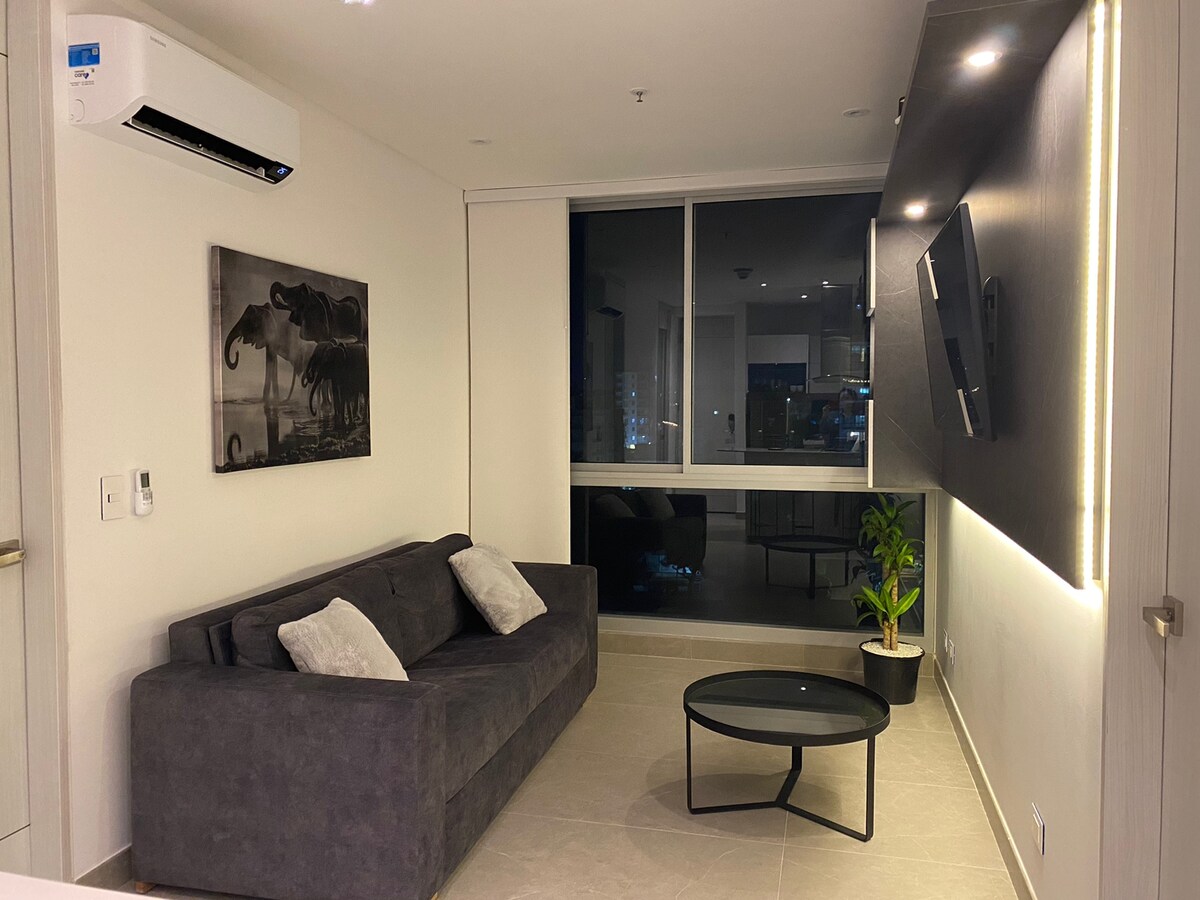 Comfortable and beautiful apartment with 2 bedrooms, each with a closet, private bathroom and AC. Main bedroom with double sofa bed (another double bed underneath) and the secondary bedroom with 2 single sofa beds (another 2 single beds underneath). Fully equipped kitchen. Living room and study with AC. High-speed Wi-Fi and cable signal. 3 Smart TVs. Building with a swimming pool and gym. Safe area. Please note that you must send your documentation prior to check-in (Colombian laws).