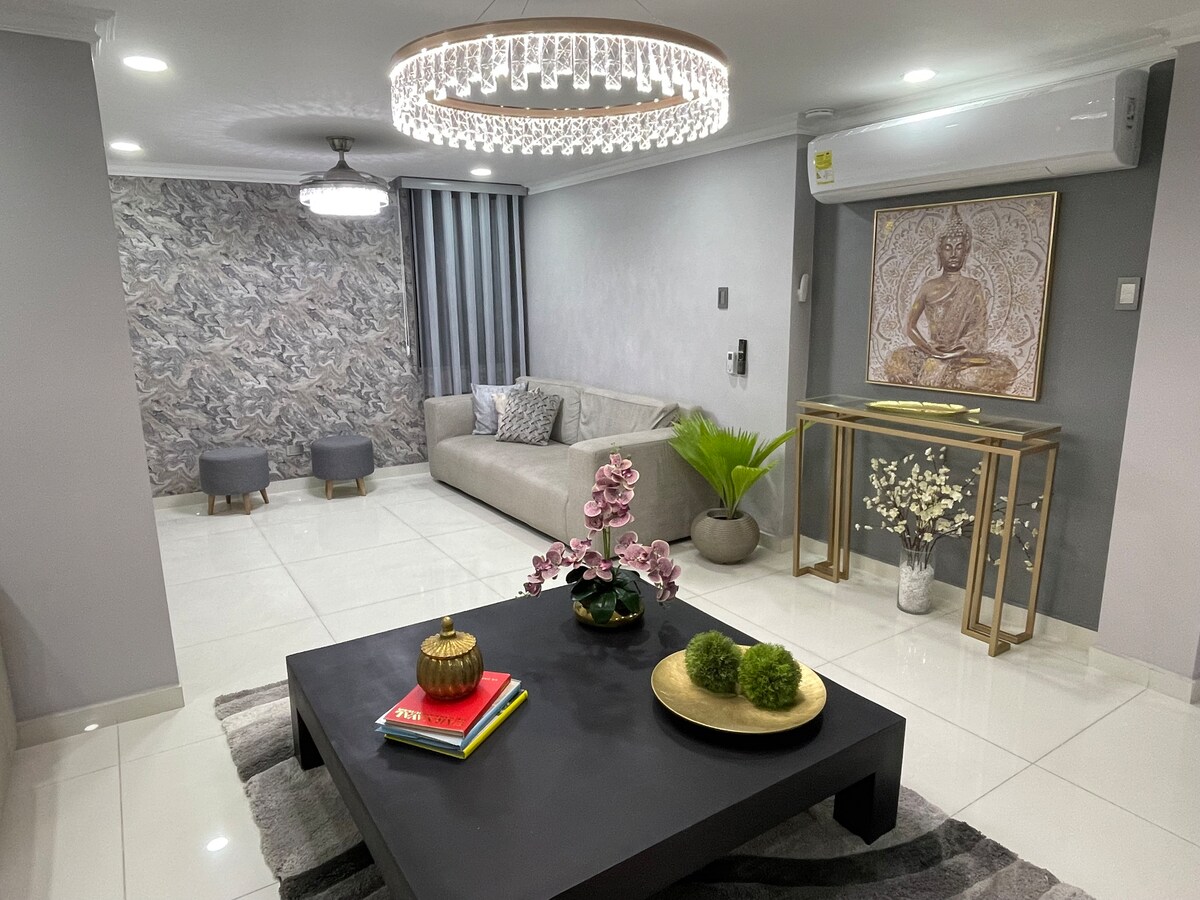Beautiful, modern apartment in Altos del Prado in northern Barranquilla. This spacious apartment is composed of: - 1 spacious entrance - an open space TV room - A sofa bed - an island kitchen - A room with a private bathroom with air conditioning - A beautiful spacious room with air conditioning - 1 fantastic bathroom, with luxury shower - 1 guest bathroom, which connects directly to the living room