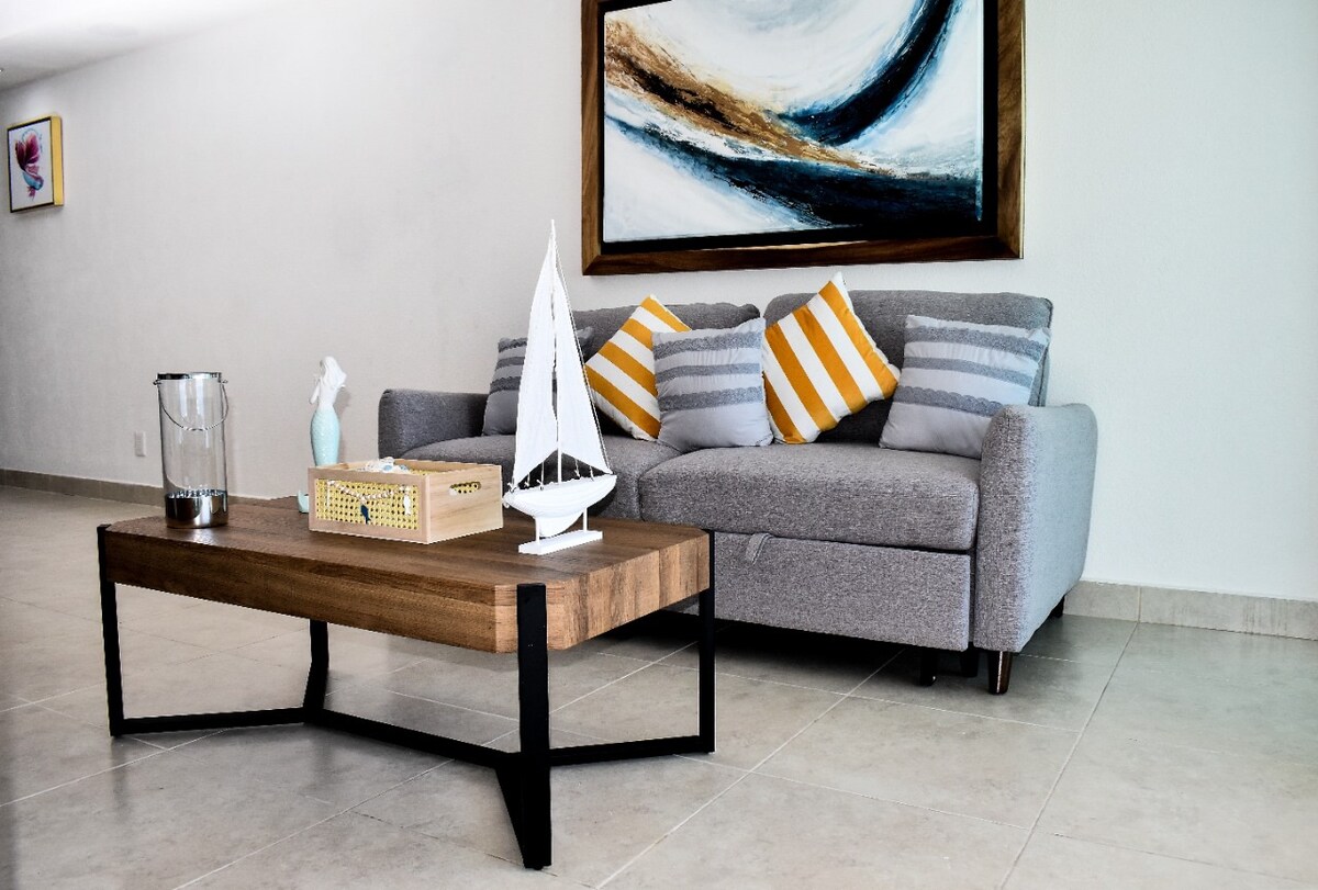 Increíble Apto. de 55 m2, totalmente equipado (Parrilla eléctrica, Horno, Micro, cafetera, licuadora, tostador, lavavajillas) y aire acondicionado central. Ideal y súper cómodo para 4 personas en Marítima Golf, excelente ubicación dentro de Fracc. Flamingos, con espectaculares vistas al mar y al campo de golf. NO PET FRIENDLY 🚫 Contamos con acceso privado a playa con baños, regaderas. 2 Albercas en PB y en Roof Top con vistas espectaculares de la bahia y campo de golf. Gym súper equipado