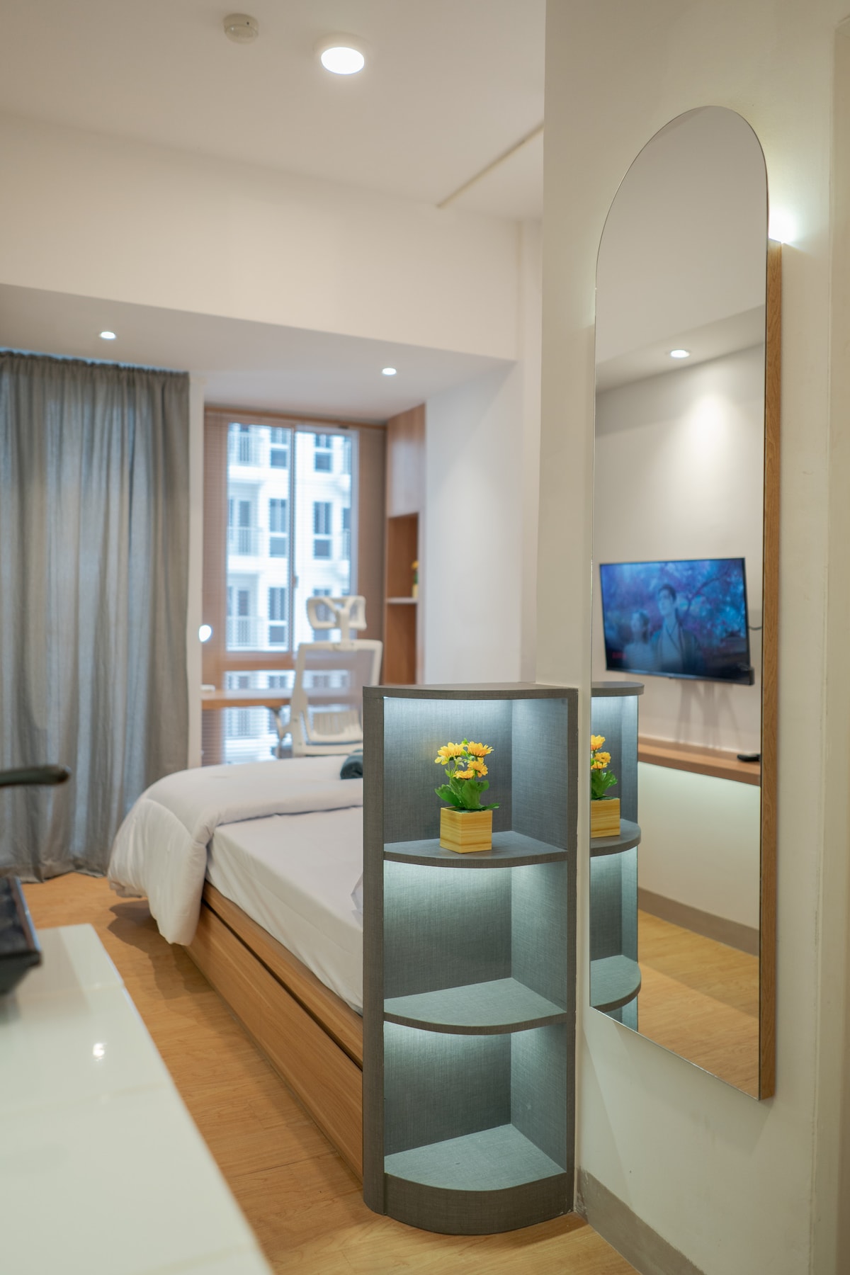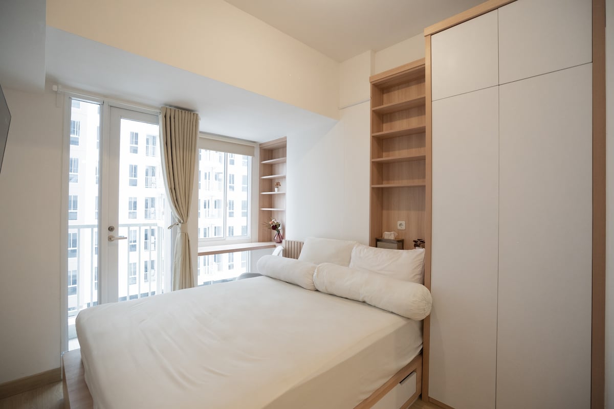 Our apartment is brand new and decorated minimally for comfort. We accept longer stay (weekly/monthly) at a special rate, inquiry with us! Room details : - Queen bed size 160 x 200 - Smart TV for Netflix chill - Working table - NON SMOKING, if you SMOKE, we charge IDR 1.000.000 to clean up
