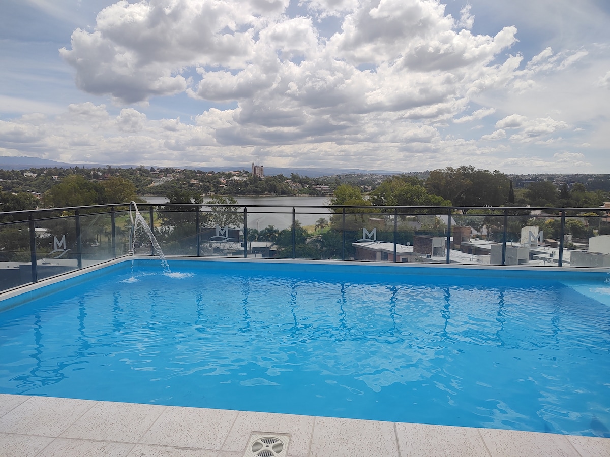 New Dept at Villa Carlos Paz, 50 meters from the Lake. It has a pool overlooking the lake, grills and garage. Private security 24/7, 5 minutes from Centro and 15 blocks from the terminal. The dpto has a Queen bed and 1 double sofa bed/ 2 Smart TV with cable/ Wifi/AA/Shower/Microwave/Electric oven and anafe/Extractor/Electric Pava/Toaster/Full tableware/Bedding and bathroom/Reposeras/Elevators/Automatic door