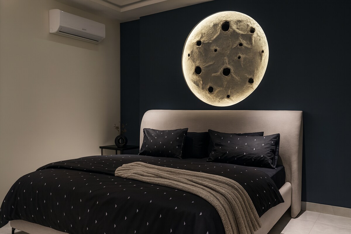Our 1 BHK Orbit Penthouse in DHA Phase 5 is where urban chic meets celestial cool. Think: a glowing moon wall for those late-night selfies and a bold dollar-stacked art piece that screams "main character energy" Wake up to park views from your private balcony swing, binge your faves on the 50" 4K Smart TV, or cook up something aesthetic in the fully loaded designer kitchen. The interiors? Abstract, stylish, and made for the feed. Plus, you're right next to Lahore's hottest dining spots.