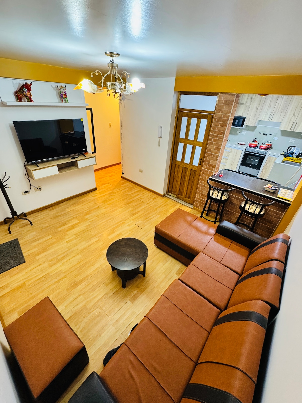 Moderno departamento en estreno a pocos metros de la plaza de armas, equipado completamente con todo lo necesario para que tengas una cómoda estadía en Puno. El departamento está ubicado en un 2do piso ubicado en el centro de la ciudad, zona segura a 2 minutos caminando de la plaza principal y de la calle principal de la ciudad, donde se encuentran los restaurantes y bares de la ciudad. El departamento tiene una cocina completamente equipada y cómodas camas, además de una amplia sala.
