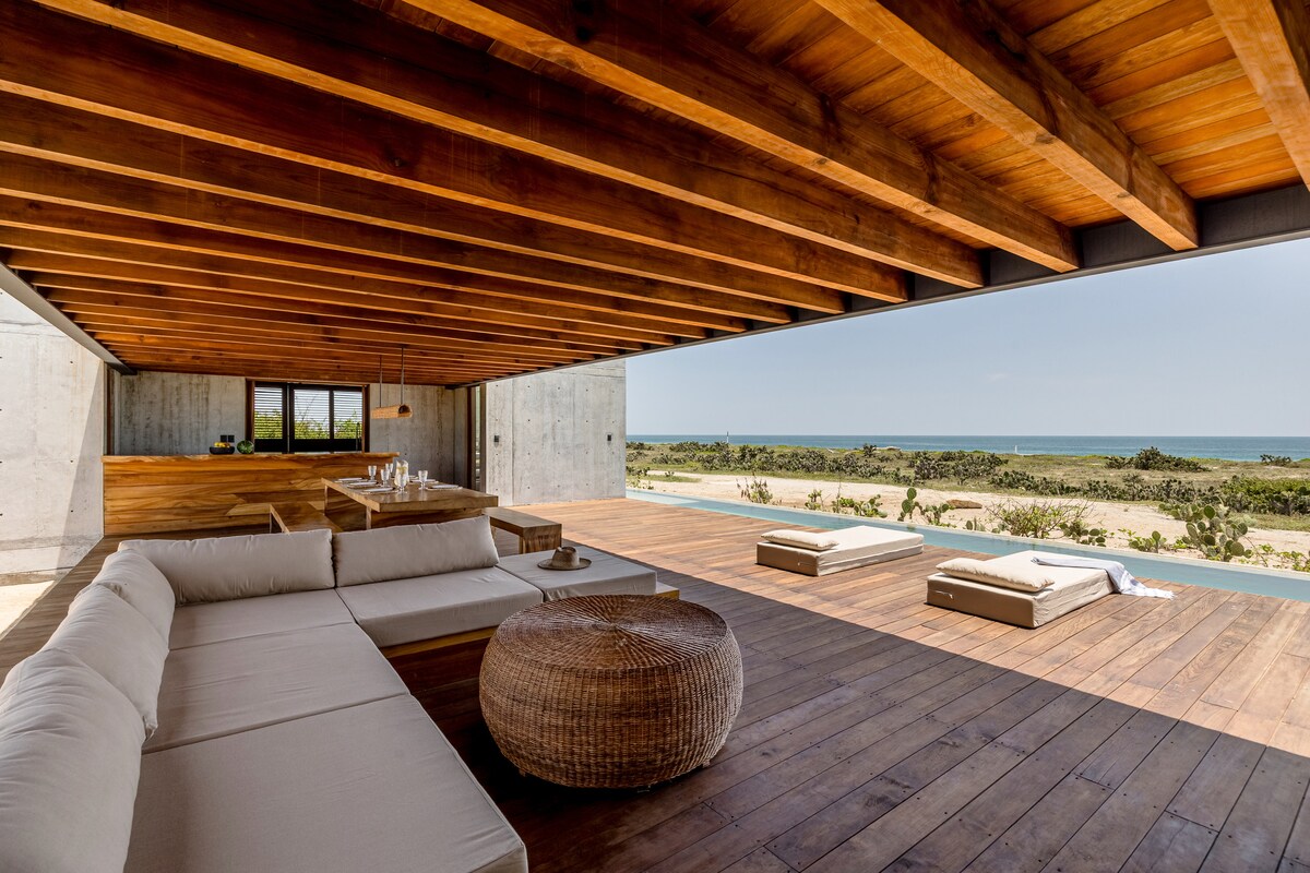 Waking up in this place is a dream! The house is right on the beach facing the ocean to enjoy the best sunsets every day. It has two levels. The bedroom is at the top as is the workspace (Starlink) and hammocks to rest. The roof is a large palapa. The house has a small private pool from which you can enjoy the best view of Mermejita beach. The house is very open to enjoy the freshness of the wind and the best views.