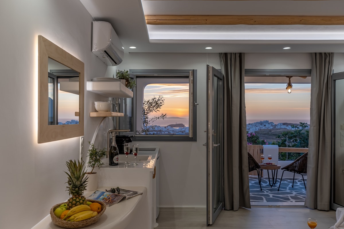 Fully equipped 40sqm self catering suites with use of the infinity pool, set in an intimate, rural complex with beautiful landscaped and maintained gardens. Luxury Italian furnishings, flat screen TV with Netflix, very fast Wi-Fi. Own terrace and deck with breathtaking 270 degree views over the Aegean sea, surrounding islands and sunset. Suited for couples and families looking for a quality, safe and peaceful environment yet very close to the main town of Chora. Not suited for party people!!