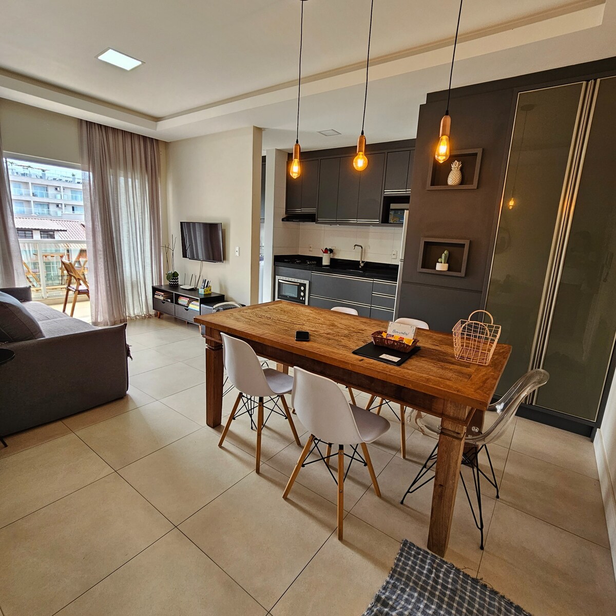 This informal apartment was designed for you to feel relaxed with those you love, whether at the barbecue on the balcony, watching the sea in the distance or the movement on the street. The integrated space of the living room, kitchen and barbecue area are an invitation for everyone to be together. The heated adult and children's pools await you! You can use the gym and the Jacuzzi. To get to the beach, just walk a block, with the cart, chairs and umbrella that are available. You'll have everything at hand and you won't even need to use the car.