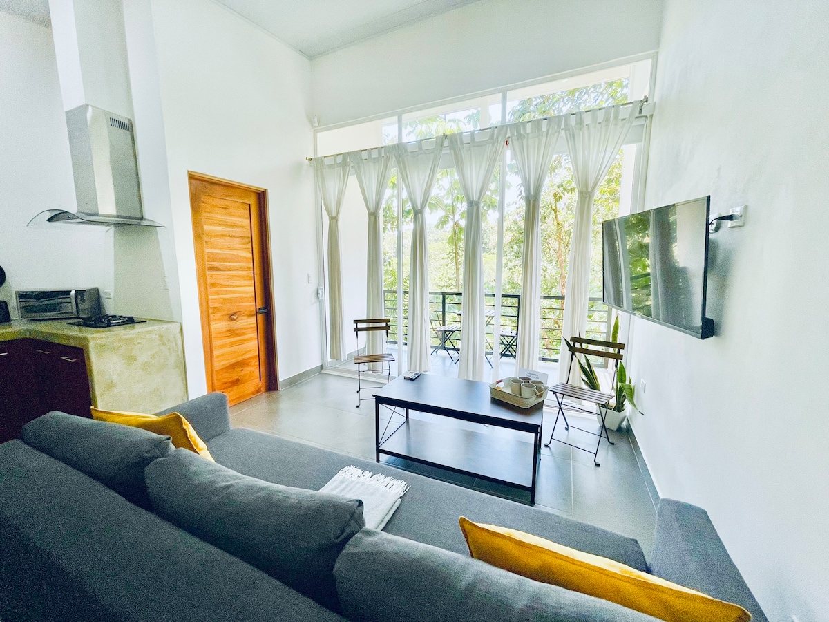 Beautiful studio conveniently located close to town With 1 King bed it can comfortably accommodate 2 adults Offering a modern design, luxury furnishings, and amenities these brand new suites will be a perfect home base during your stay in Manuel Antonio These suites feature large windows and lots of natural light with astounding views, plus a balcony overlooking the rainforest and pool area, private bathroom and shower with heated water, silent A/C, smart tv 43", cable TV, and elevator access