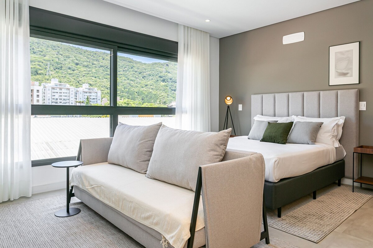 A studio that redefines the hosting experience! Enjoy a sophisticated environment with a queen bed, air conditioning, sofa, Smart TV, and a full kitchen for your meals. Plus, a gourmet space on the balcony. Located near the Jardim Botânico (Botanical Garden) and UFSC, you'll have easy access to a complete network of services, bars, and restaurants. The building offers complete leisure with a pool and a gym. Book your stay and live this experience.