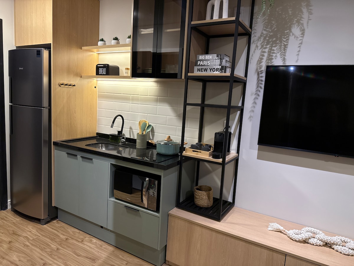 O Studio localizado no Almagah 227, foi projetado com atenção a cada detalhe para oferecer conforto, praticidade e um design moderno. O móvel flexível que vira sofá garante melhor circulação e pode ser usado para reuniões ou momentos de descanso. Há área exclusiva para refeições com futon e mesa, cozinha equipada com geladeira, armário espaçoso e cafeteira de expresso. A iluminação versátil e a smart TV grande completam a experiência.