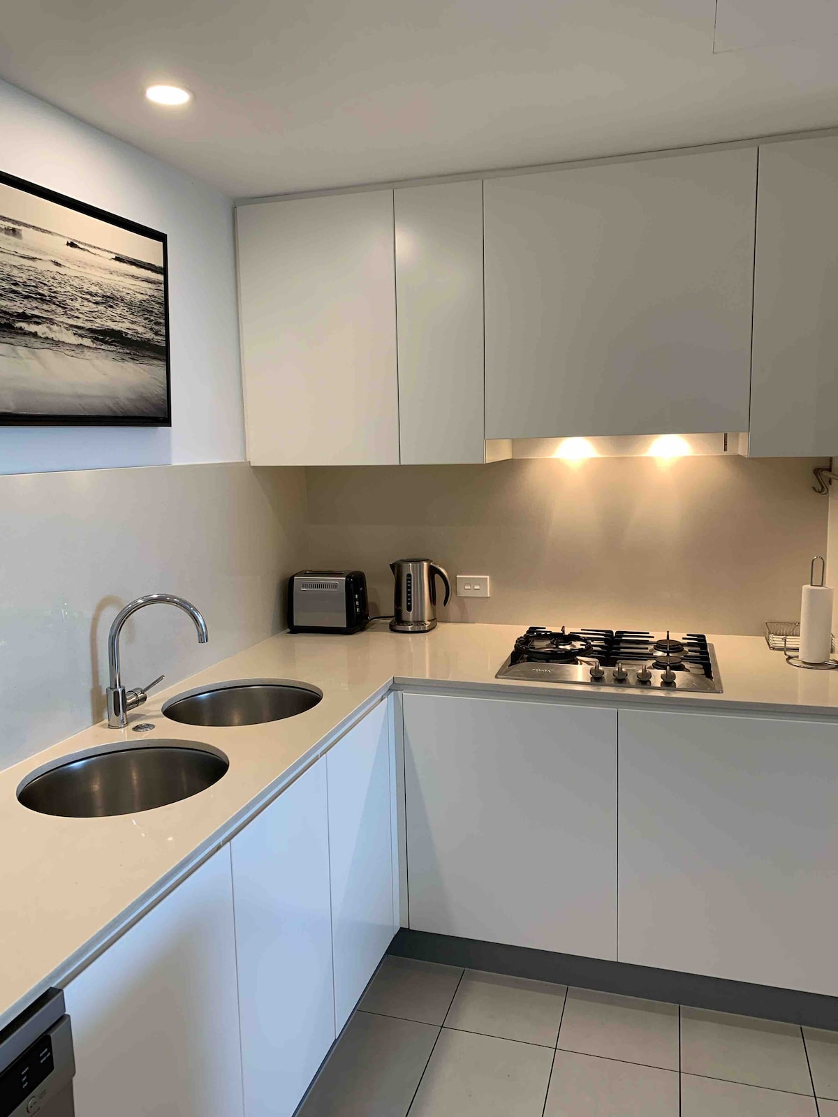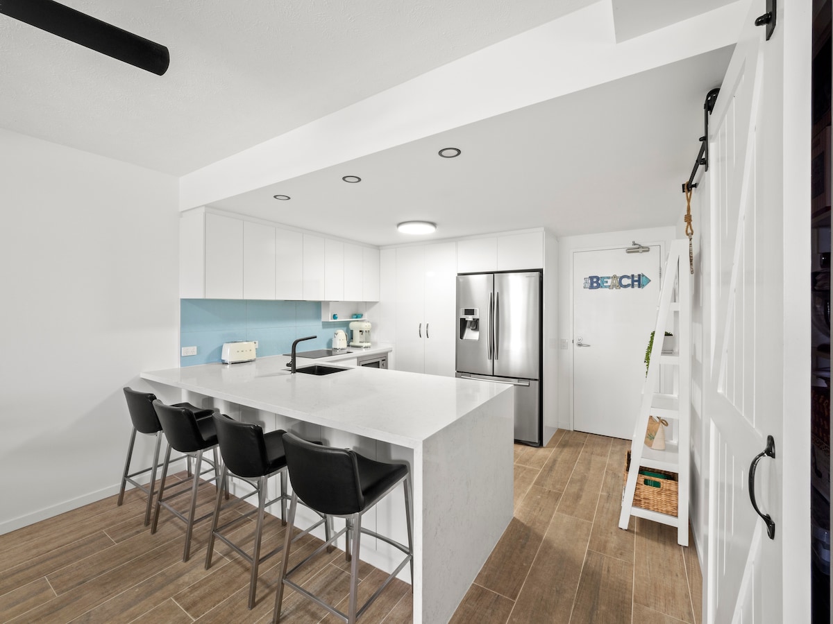Luxury beach front unit, freshly renovated. Master BR-king sized bed & ensuite 2nd BR-queen sized bed. 2nd BR queen sized sofa bed in lounge to sleep 6. Heated pool and spa &Gym in a secure complex with games room. Centrally located & walking distance to Buses, shops and other amenities. Dining Table kitchen Island Fans & air con in master & Living fan in 2nd bedroom Chrome Cast TV with Youtube & Netflix Full Kitchen Facilities, Convection & Air Fryer Kettle & toaster Hairdryer Washing Machine