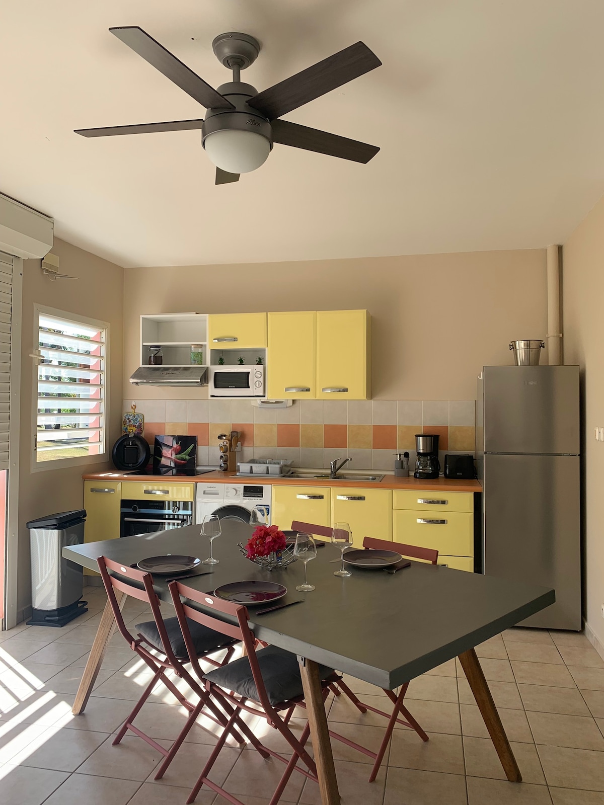 A few minutes from the ferry terminal, the marina and the Raisins Clairs beach, this charming bungalow against a backdrop of coconut trees will welcome you in its cozy space to make your stay the sweetest of moments. The kitchen and dining area are located on the terrace, with direct views of the pool. You will feel completely independent, but we will still be close by, upstairs from the villa, to meet your expectations and ensure your perfect peace of mind.