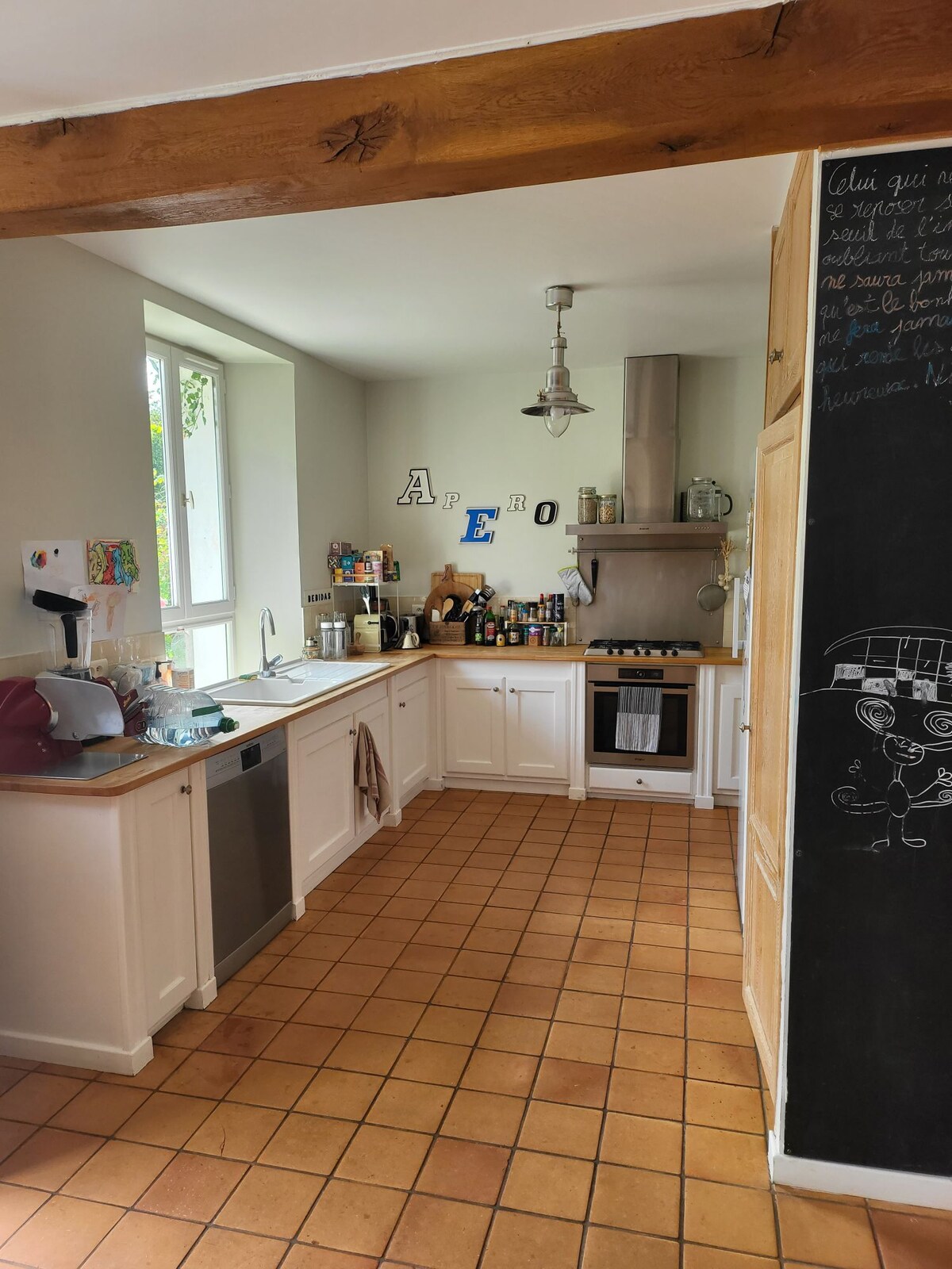 The Atelier is a bright and warm cottage, ideal for stays for families or groups of friends. It accommodates up to 8 guests, with the possibility of adding cots or children's mattresses. The large table provides dining space for 8, a side table can be added for 15 guests. Open kitchen, antique furniture, original paintings and wood-burning stove. Up to 14 people with the adjoining house bedrooms. 3 minutes from Épernon, just outside Paris.