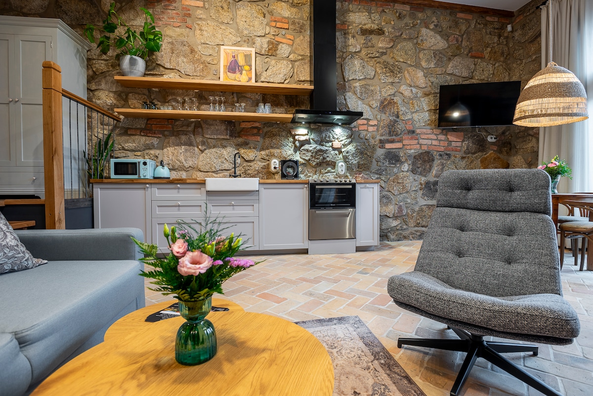 Every fragment of the turret, every room is a blend of history, old materials, and the medieval spirit with design and comfort. Here, nothing is perfect... no right angles, no obvious spaces. There is plenty of stone, wooden floors, old restored windows, a wooden staircase in the center of the house reminding you of the age of the home. There are cobwebs that appear out of nowhere. There is a soul. The bathroom, which invites you to bathe in an old cast iron tub, and a sauna...