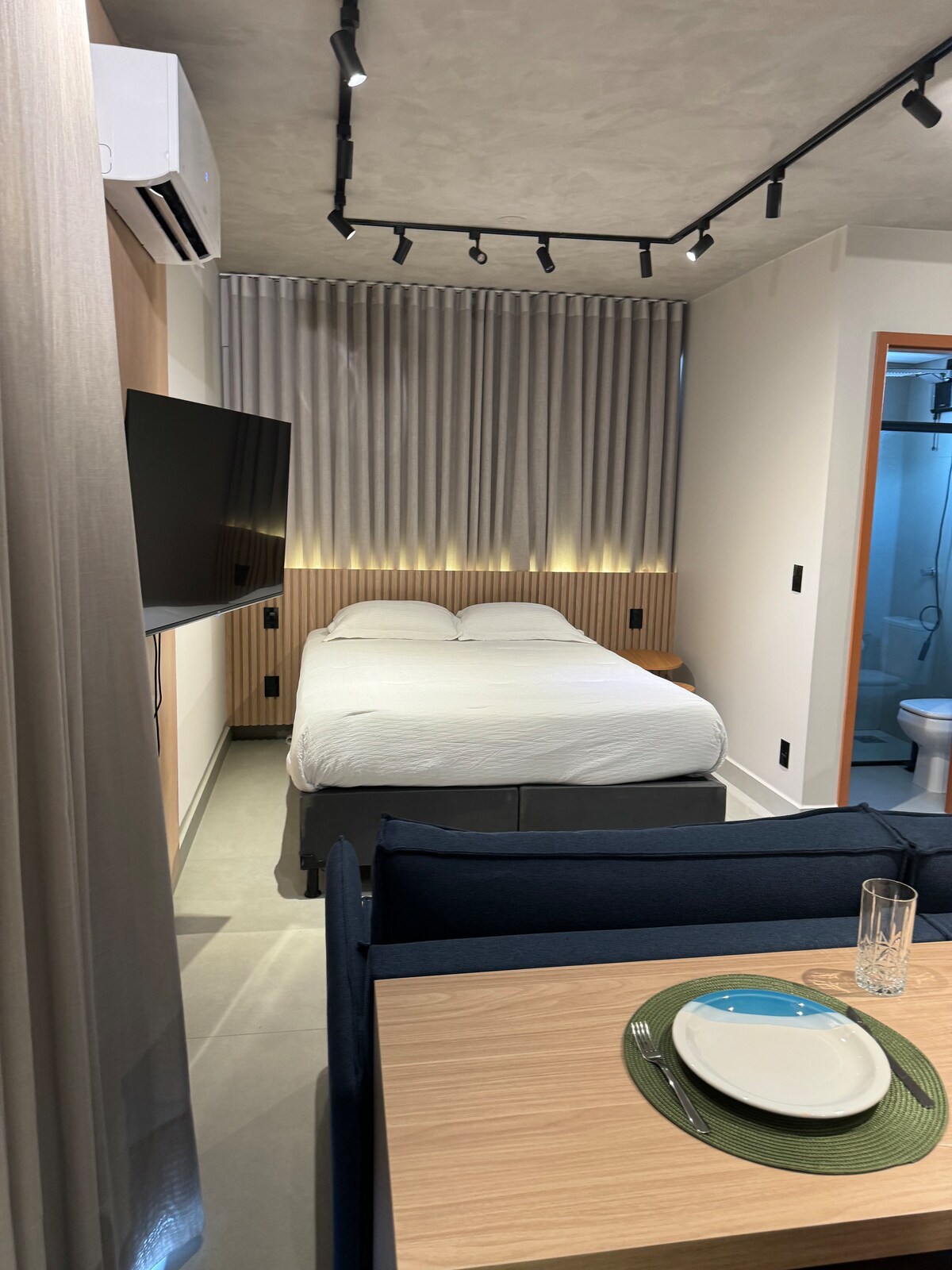 Studio Ăpera ĂŠ completo e cheio de charme no 3Âş andar, com uma vista linda e ambiente acolhedor. A cama queen e sofĂĄ cama sĂŁo confortĂĄveis com ar-condicionado e SmartTV que garante bem-estar. A cozinha estĂĄ equipada com utensĂlios, liquidificador, sanduicheira e cafeteira com pĂł de cafĂŠ de mimo, porque aqui, cada detalhe importa. Ideal para atĂŠ 3 hĂłspedes, o espaço oferece enxoval completo com toque de hotel boutique, pensado para quem valoriza conforto e praticidade.