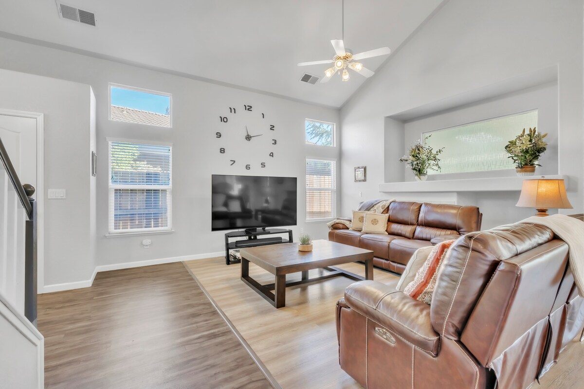 This Broadstone home is perfectly located near everything Folsom has to offer: 🏡Quiet, peaceful neighborhood 🫧Obsessively clean 🛝Kemp Park: playground, waterpad, trails 🛍1.5 miles to Palladio shopping 🍎3.5 miles to Old Downtown, Farmer's Market & Zoo 🏞6 miles to Folsom Lake ✨️No chores @checkout, just lock & go! 🔐Easy keypad entry 🚗2 driveway parking spaces included 🛏 King bed, premium mattresses 🔥Gas grill & firepit in backyard 🐕Well behaved pets are welcome (w/approval)