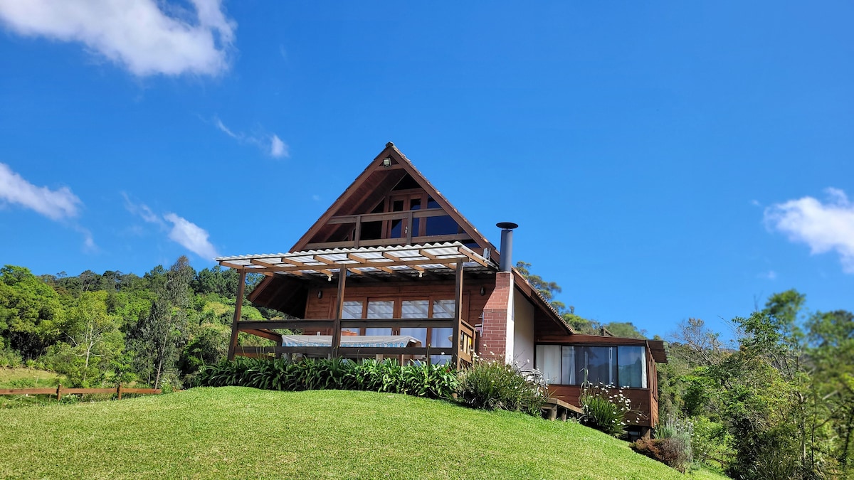 Relaxe neste lugar único e tranquilo. Hospedagem com 1 café da manhã por estadia. Chalé charmoso e aconchegante estilo A-frame, acomoda 1 casal e até 2 crianças pequenas. Localizado no alto do morro, cercado por verde com uma paisagem de tirar o fôlego e uma vista privilegiada, em frente avista-se o mirante da Boa Vista.