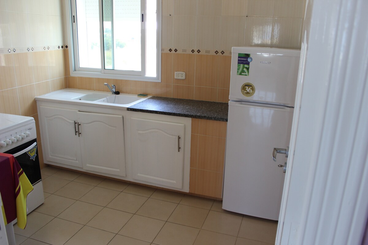 Apartment on the 3rd floor (with elevator) with direct sea view. This apartment features a master suite, 2nd bedroom, living room, kitchen and shower room. 100 m from the beach, the apartment is located in a quiet area halfway between the city center of Mahdia and the tourist area (2 km), it is close to different shops (gazebo, tea room, shops...).