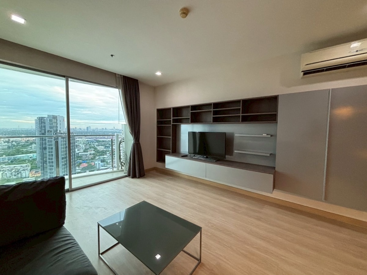 2-bedroom duplex with sweeping panoramic views over Bangkok. Floor-to-ceiling windows flood the space with natural light, while the modern Japandi interior creates a calm and elegant atmosphere ideal for couples, families, or business travelers. Fully equipped kitchen, spacious living area with a 65” smart TV & private balcony. Direct access to a gym and wellness spa on the same floor, plus a rooftop sky pool and sun deck above. Food hub, cafés, and a 24/7 Mart are located inside the building,