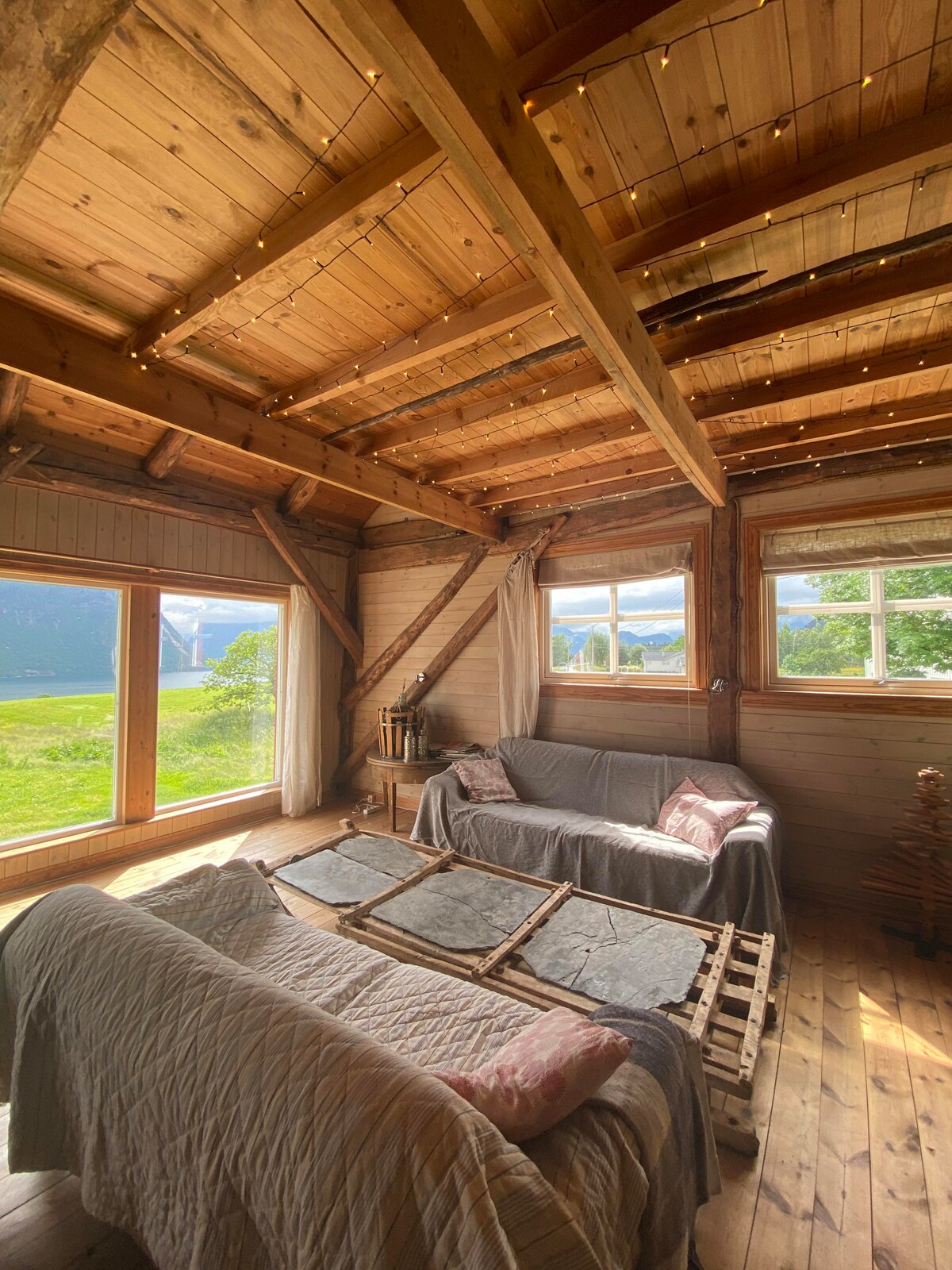 This is an old barn that has been renovated and made into a spacious apartment. Through the big windows you can enjoy the view of the fields, fjord and mountains. There is a good variety of hikes nearby, easy access to the beach if you feel for a dip:-)Isfjorden is 8 mins away by car, Åndalsnes 15, and Molde an hour. The closest bus stop(Åndalsnes-Molde)is a three mins' walk away. There is a small cabin near the barn, next to our vegetable garden, where you will find the beds.