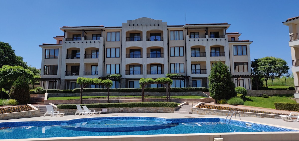 Santa Marina is a beautiful holiday village located near old town Sozopol. It is famous for its large and green territory. Our villa is the closest to tennis courts! Apartments are freshly renovated: ☑️smart TV ☑️comfortable terrace with a sea view and relax zone ☑️beach towels and kids toys ☑️coffee machine 🏖️5 large swimming pools with jacuzzi and 2 sand beaches 🍽️4 restaurants, pool bars and 2 mini markets 🎾6 modern tennis courts, football and volleyball field