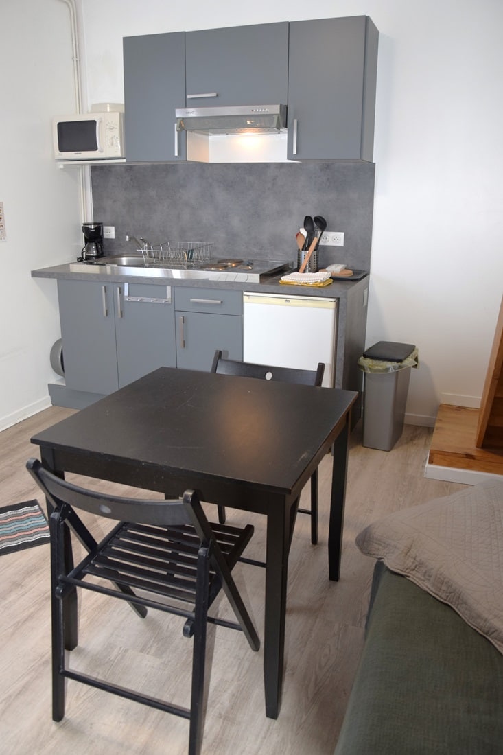 Nice little studio with its kitchenette equipped with a hot plate, microwave and fridge with everything you need to cook. A Dolce Gusto is available to enjoy your coffee as well as a bar table with stools. The bed folds away to access the sofa during the day. You can watch TV and enjoy a Wi-Fi connection. The bathroom equipped with its shower and toilet, although small, is organized so that it is as functional as possible.