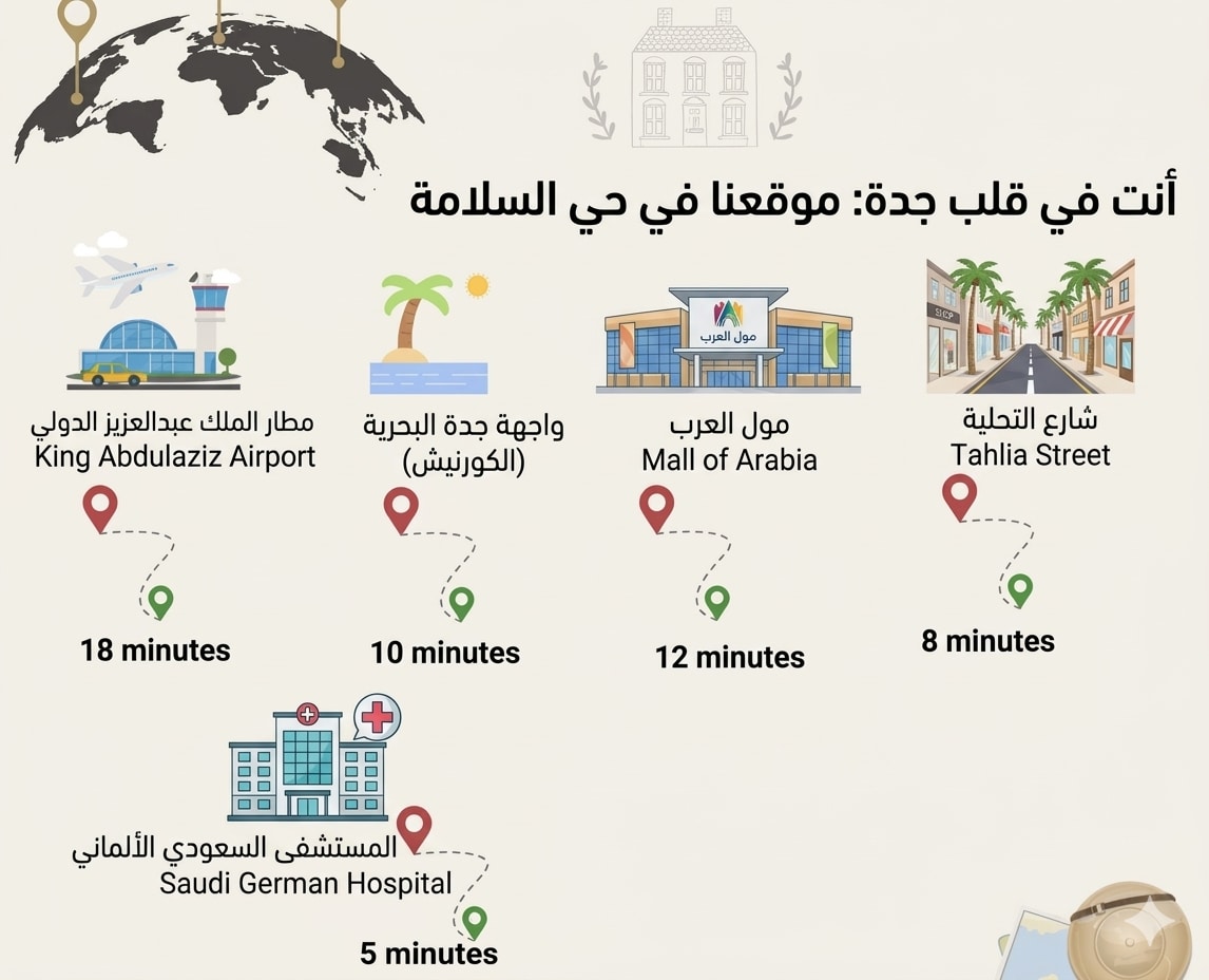 Welcome, Our apartment is located in the heart of one of the most vibrant neighborhoods, and it is in the middle of the most important roads in Jeddah, the 60th Road and Prince Saud Al-Faisal Road, each of which is two minutes away. Moreover, the neighborhood is close to the Tahlia Road, which is (3 km) away, and it is (3 km) away from Jeddah Park, and it is (9 km) away from King Fahd Military Hospital and (4 km) away from the Specialized Hospital. As for travelers, King Abdulaziz Airport is (17 km) away from the neighborhood, which enhances the ease of access to it and movement between the city and the airport.