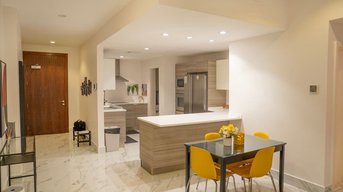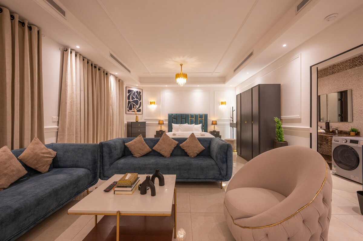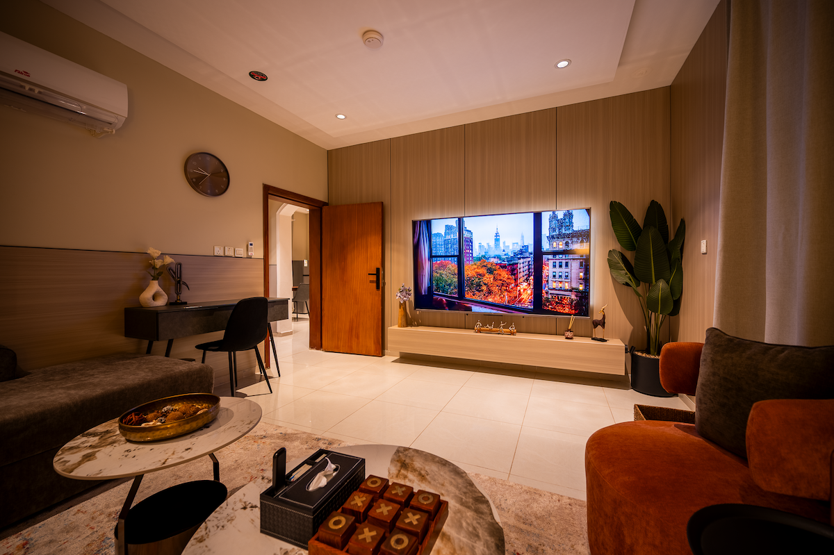 Our stylish and modern apartment is located in the heart of the city, just around 12-minutes drive from the airport and RedSea. You'll find yourself surrounded by restaurants, markets, and entertainment. The apartment features a spacious living area with a new 75-inch LG smart TV with Netflix and Shahid VIP. In the mornings, wake up to a cup of coffee from our Nespresso machine. Throughout ou'll enjoy luxurious furnishings and thoughtful decor that creates a cozy yet refined ambiance.